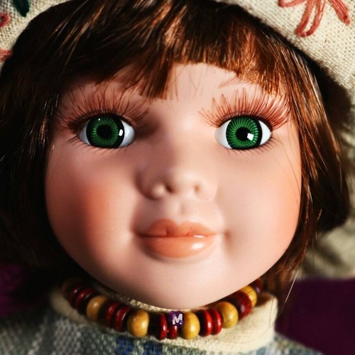 You will be receiving a beautiful porcelain doll. Ahanitra is around 14-16 inches tall. Her body is stuffed and his head, neck, and arms are made of porcelain. She has short brown hair topped with a hat and bright green eyes. She is wearing a burlap plaid dress and is holding a bear.