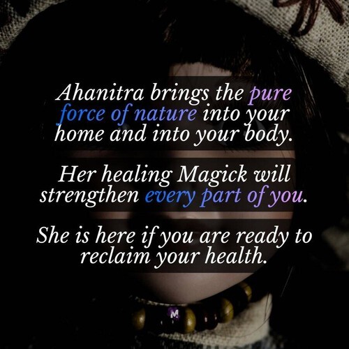 Today, I present to you the powerful Healing Deva spirit of Ahanitra (AH-hahn-EE-trah). She is a Deva. Deva's are literal incarnations of the spirit of nature. Consciousness is something given to us by an unknown force. We are not the only ones given this gift. Ahanitra, herself, was a human in her past life, but through rigorous training of her force of will, she gave up her identity and adopted that of a Deva. Devas are powerful Nature Magick healers. With her, you will see yourself recovering faster from illnesses, wounds mending quicker, and a sense of peace in your mental life.