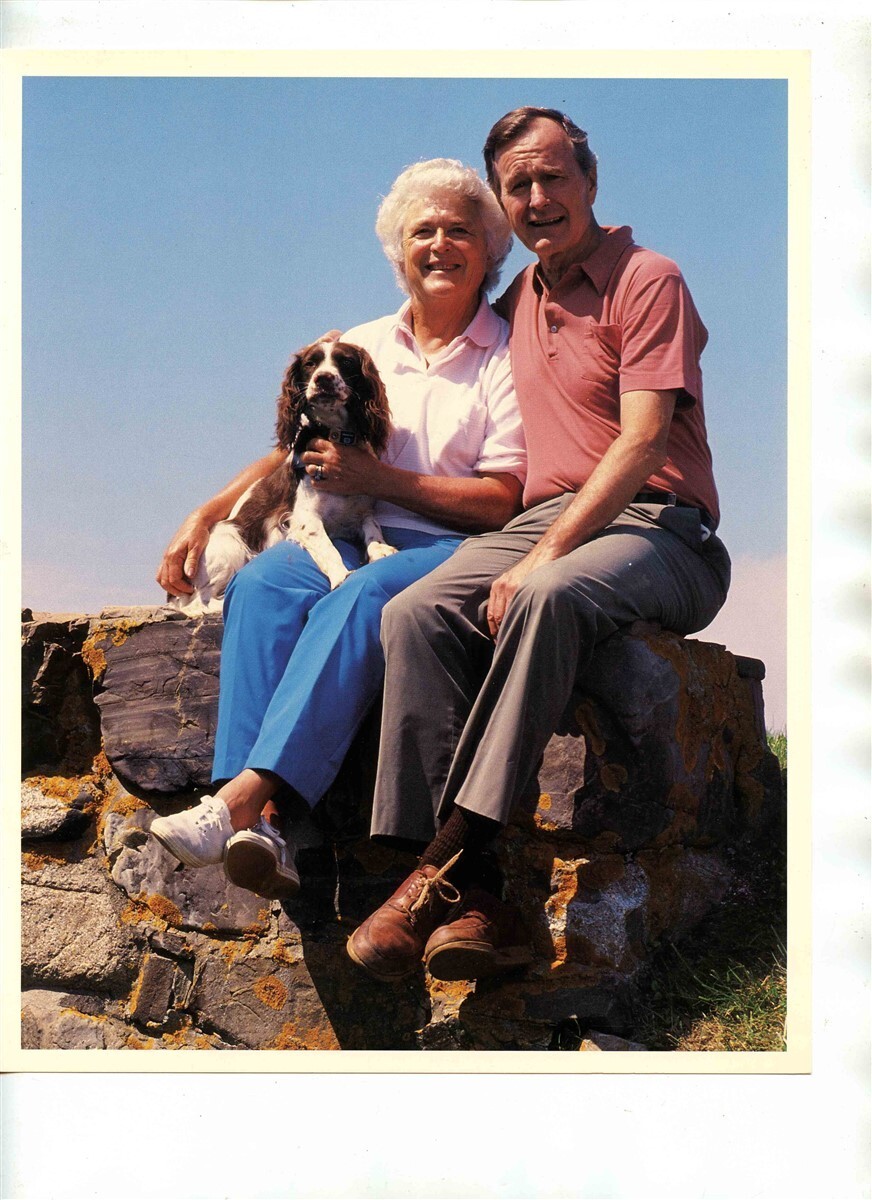 An 8x10 color photo. George H W Bush with Barbara Bush and Millie Photo
