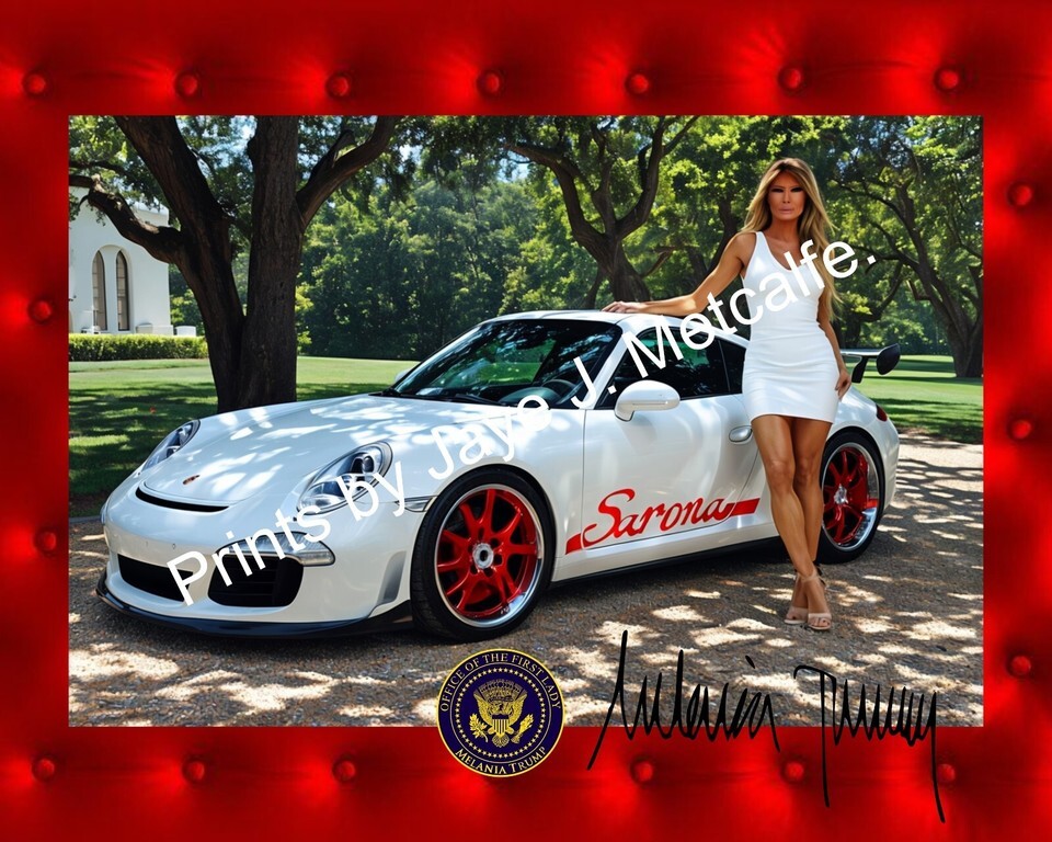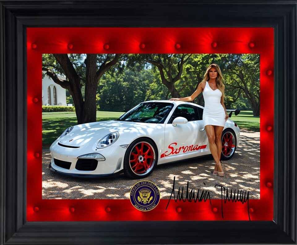 This product is a framed art piece featuring Melania Trump, measuring 11X14 inches. The item is an original and has been signed by the former President and his wife. It was manufactured in the United States and comes with a warning for Florida Prop 65.