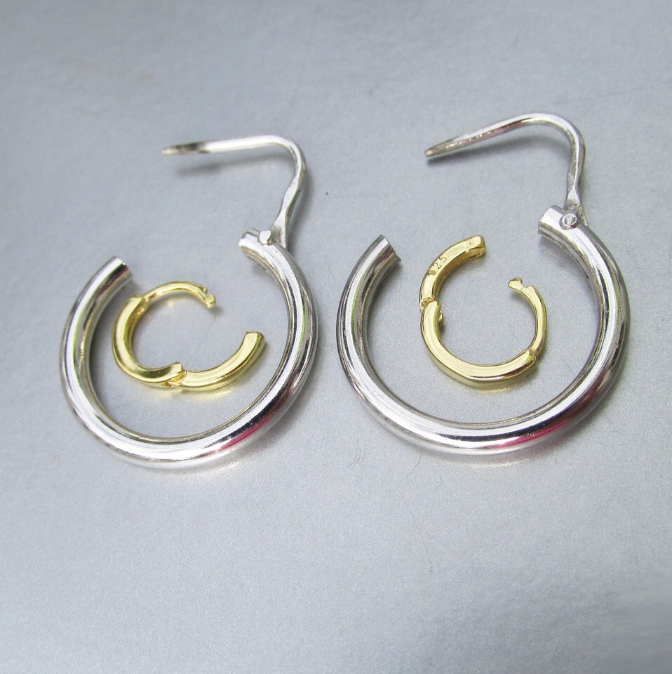 These two pair of vintage early 2000s sterling silver pierced hoop earrings both are marked 925 for sterling. The smaller pair are yellow gold plated and measure only 3/8" wide and the larger silver pair measures 3/4" in diameter. Both are in excellent, like-new condition with no sign of any wear and no damage. They will arrive gift boxed. 3165