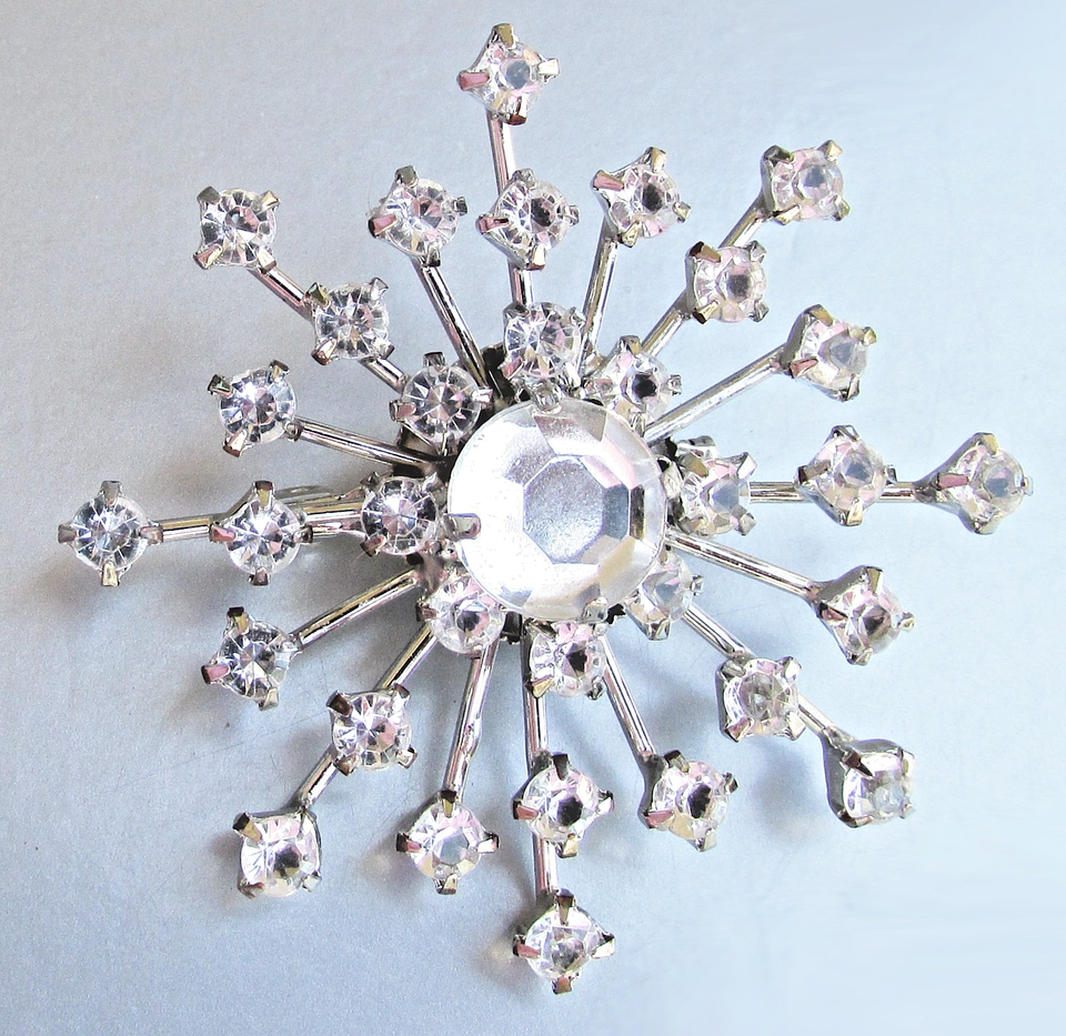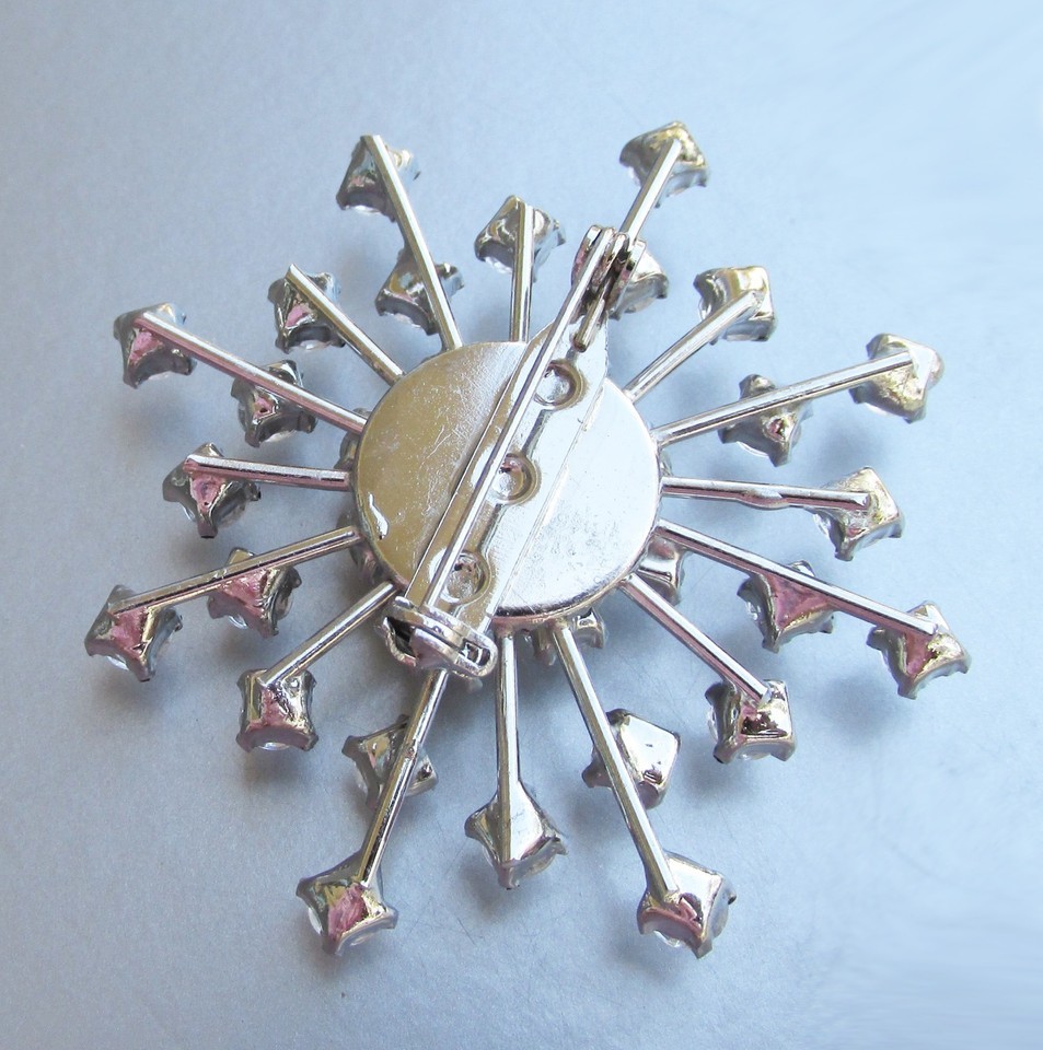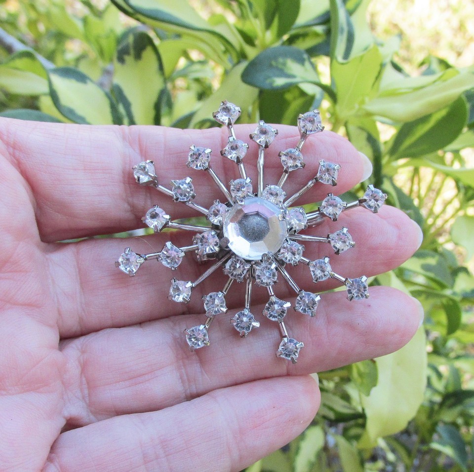 This is a vintage 1950s-1960s silver tone 2" wide star shaped mid-century modern brooch set with crystal rhinestones. It is in excellent condition with no wear or damage. It will arrive gift boxed. 3505