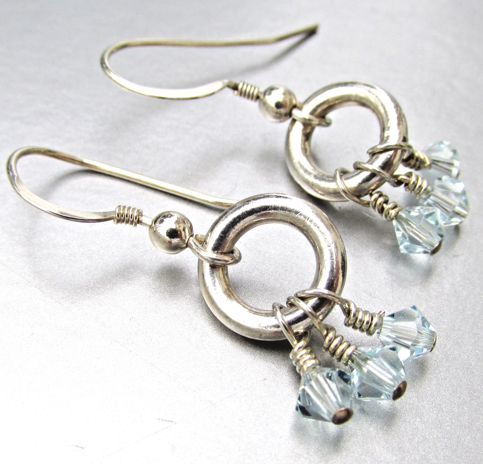 This pair of 1990s vintage sterling silver earrings have small 3/8" wide dangling hoops with three dangling light blue bicone shaped crystals. They are marked 925 for sterling silver and measure 1 3/8" long from the top of the ear wires. They are in excellent condition with no wear or damage. They will arrive gift boxed. 2723