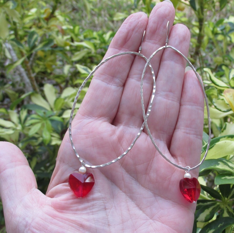 This pair of vintage 1980s dangle pierced sterling silver oval hammered thin hoop earrings have red crystal hearts with white pearl dangles at the bottom. They have sterling ear wires and measure a big 4" long from the top of the ear wires to the bottom of the heart dangles. They are in excellent condition with no sign of any wear and no damage. They will arrive gift boxed. 3119