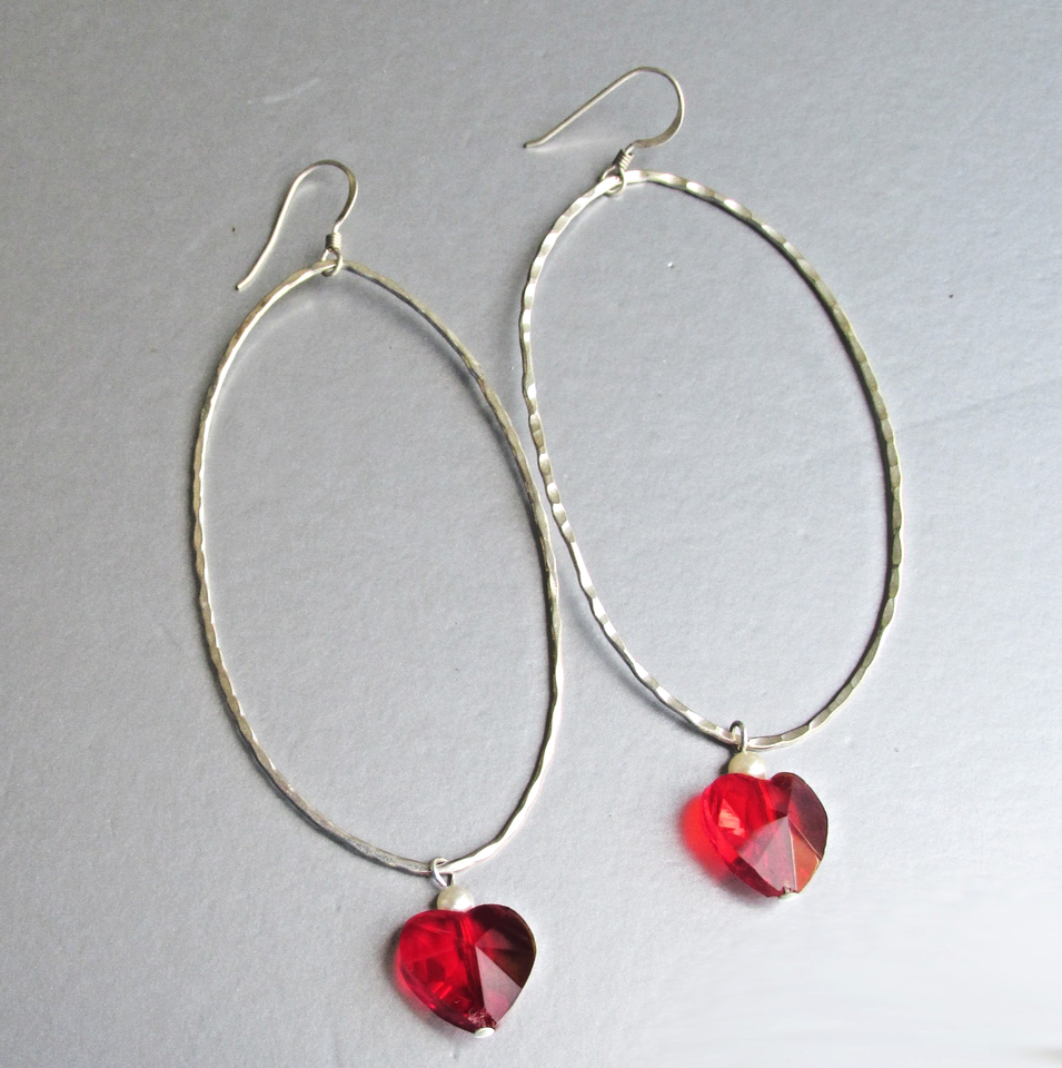 Big Hammered Sterling Silver Oval Hoop & Crystal HEART Vtg Earrings
