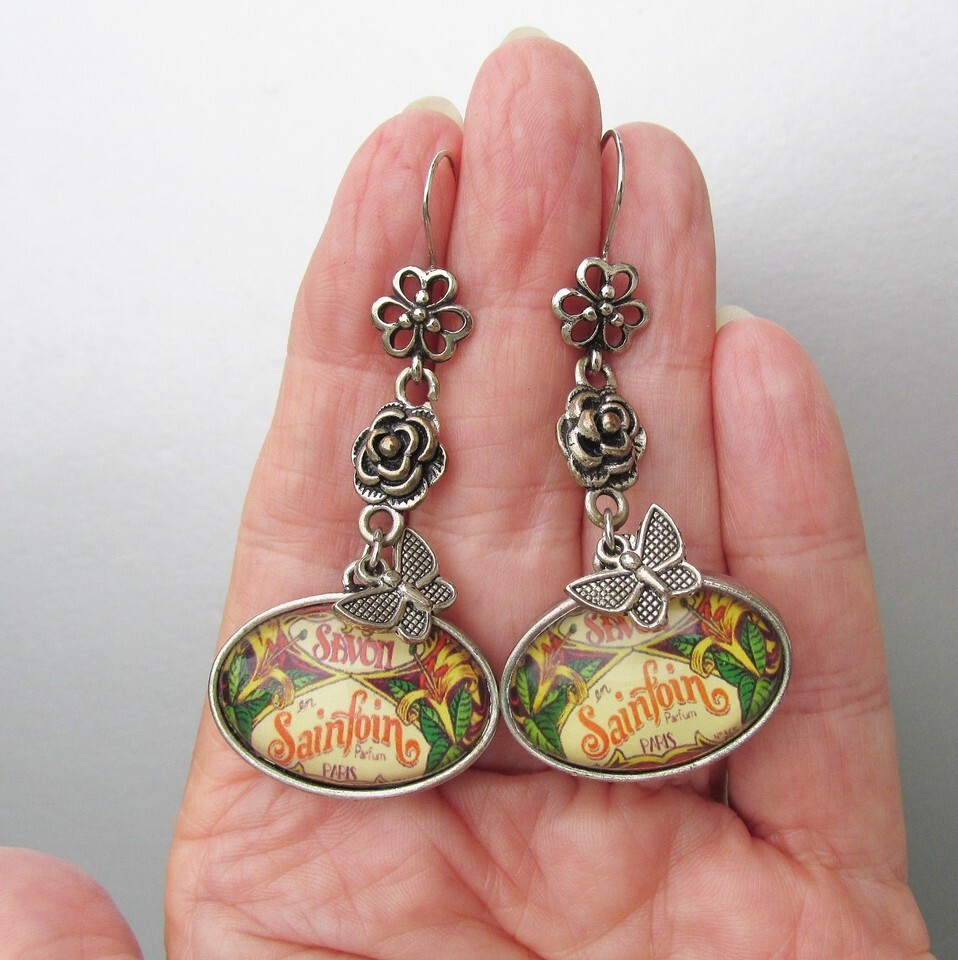 Vintage French Soap Label Long Dangle Flower & Butterfly Artisan Earrings
