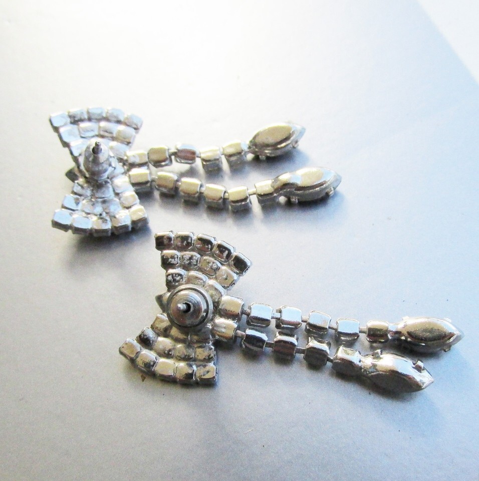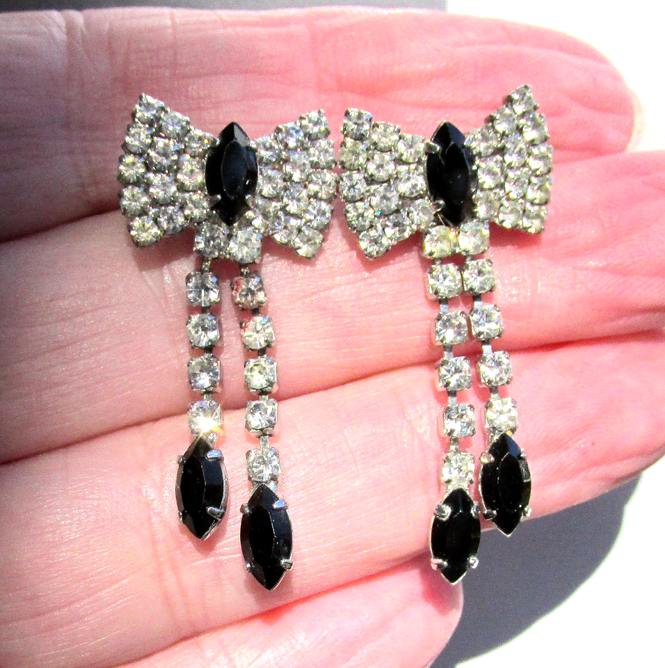 Vintage Crystal & Black Rhinestone BOW Dangle Pierced Earrings