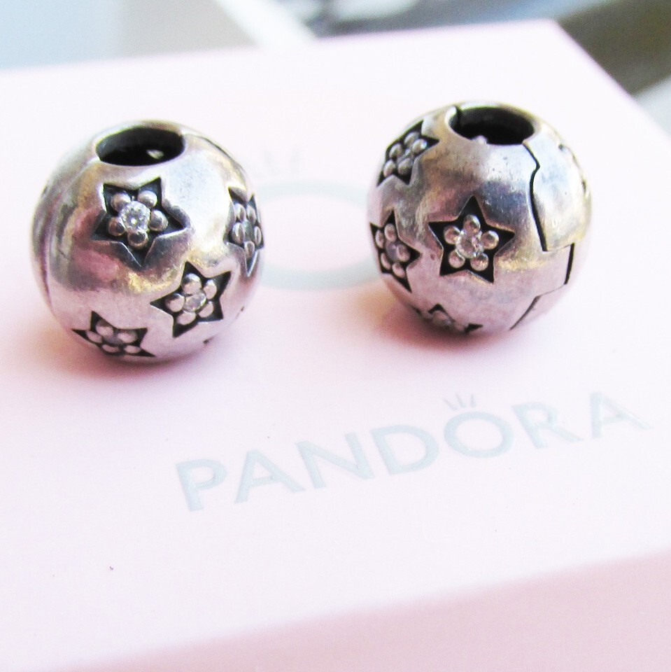 These two signed ALE 925 Pandora beads are new and still in their Pandora store box as pictured. They snap open and closed and have stars with little rhinestone flowers. They are in brand new condition. 3504