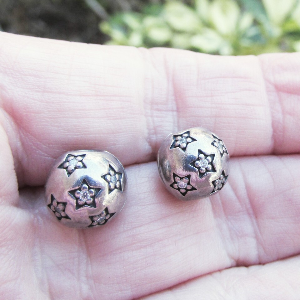 Two 2 Authentic Signed Pandora Sterling Silver Rhinestone STAR Charm Beads, BOX