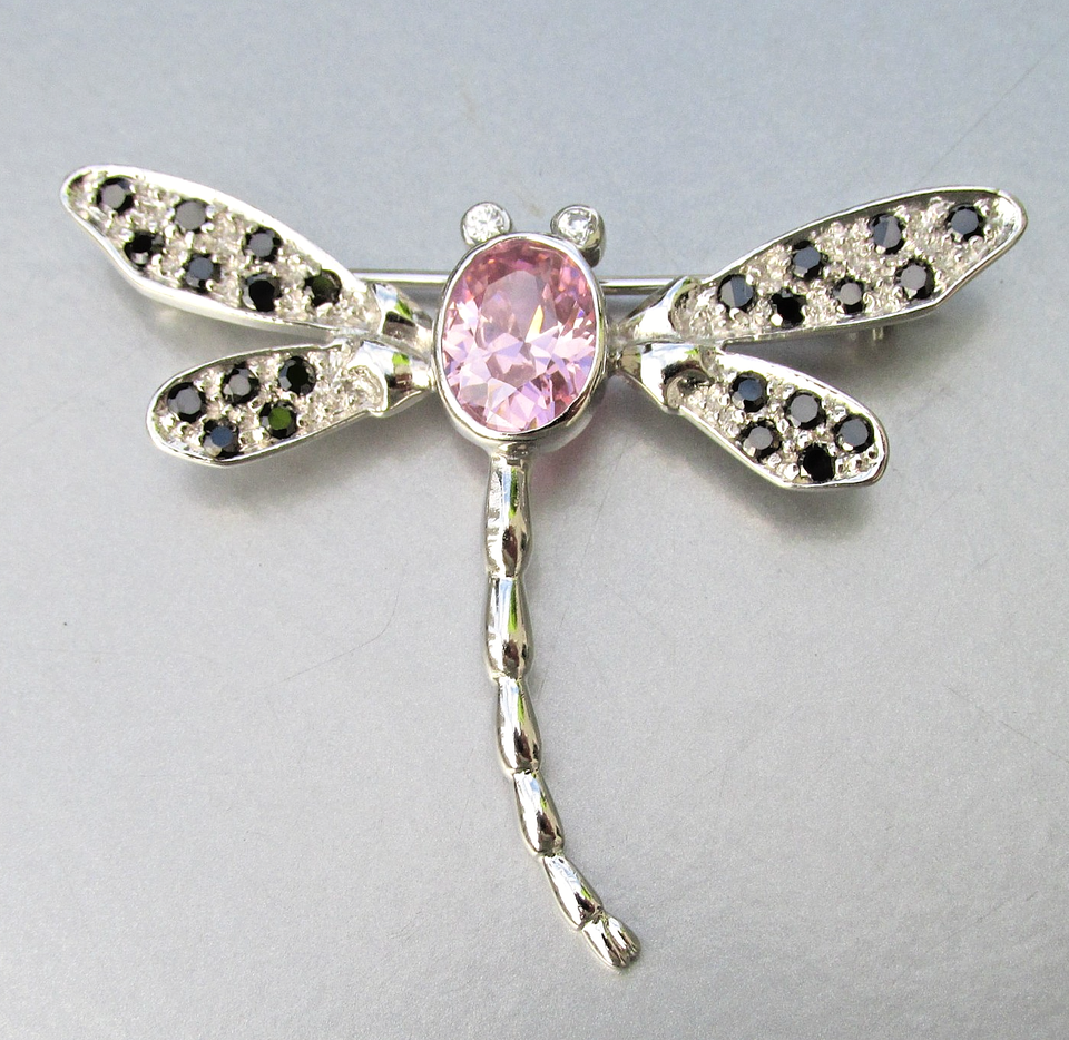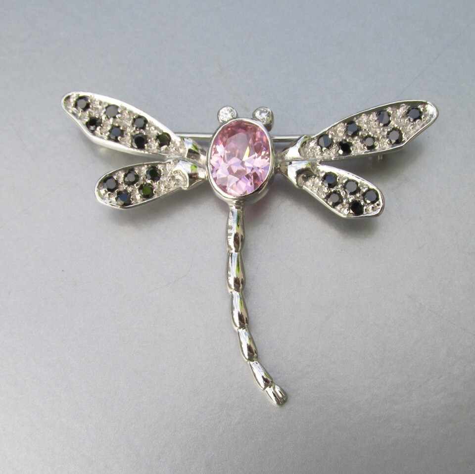 This is a beautiful vintage 1980s-1990s sterling silver dragonfly brooch that has a large sparkling oval rose quartz center stone and small black stones on the wings. It measures 1 3/4" tall and 2" wide. It is signed NF 925 for the Chapal-Zenray Company of Texas and sterling silver, plus Thailand. It is in excellent condition with no wear or damage. It will arrive gift boxed. 3152