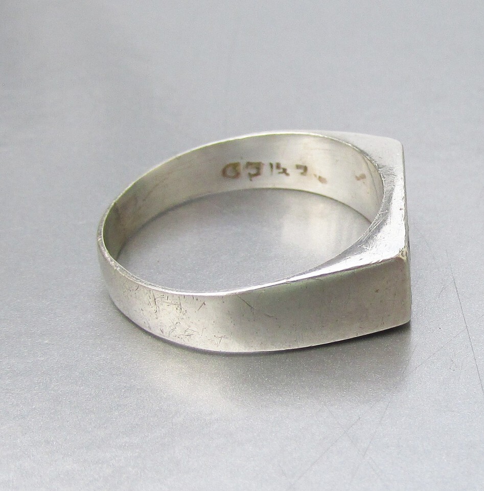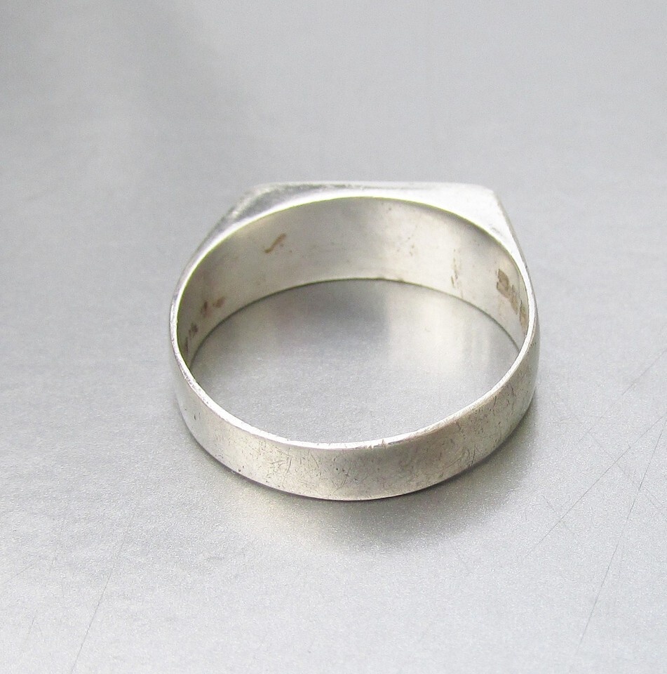 This vintage 1980s sterling silver band ring has a flat top inlaid with green stone in a whale design. The band is size 6 1/2 and is signed 925 for sterling plus what looks like, Mexico" although it is blurry and hard to read. Up close, the silver has some very faint surface scratches from normal wear, but it looks great when worn. It will arrive gift boxed. 2956