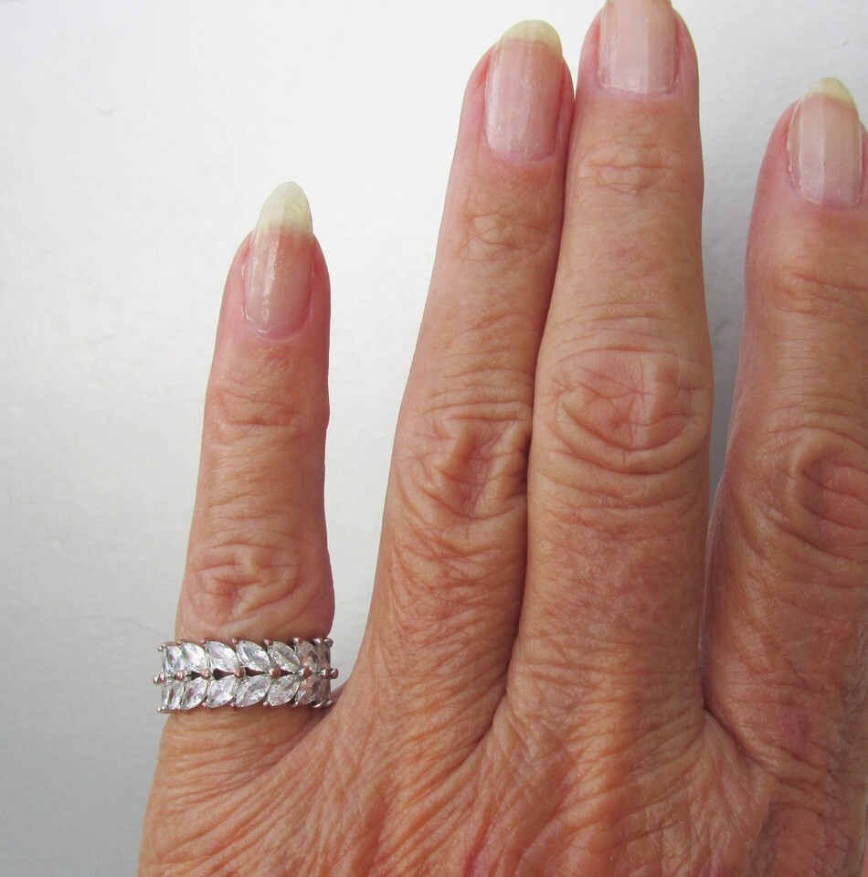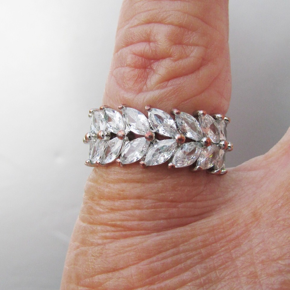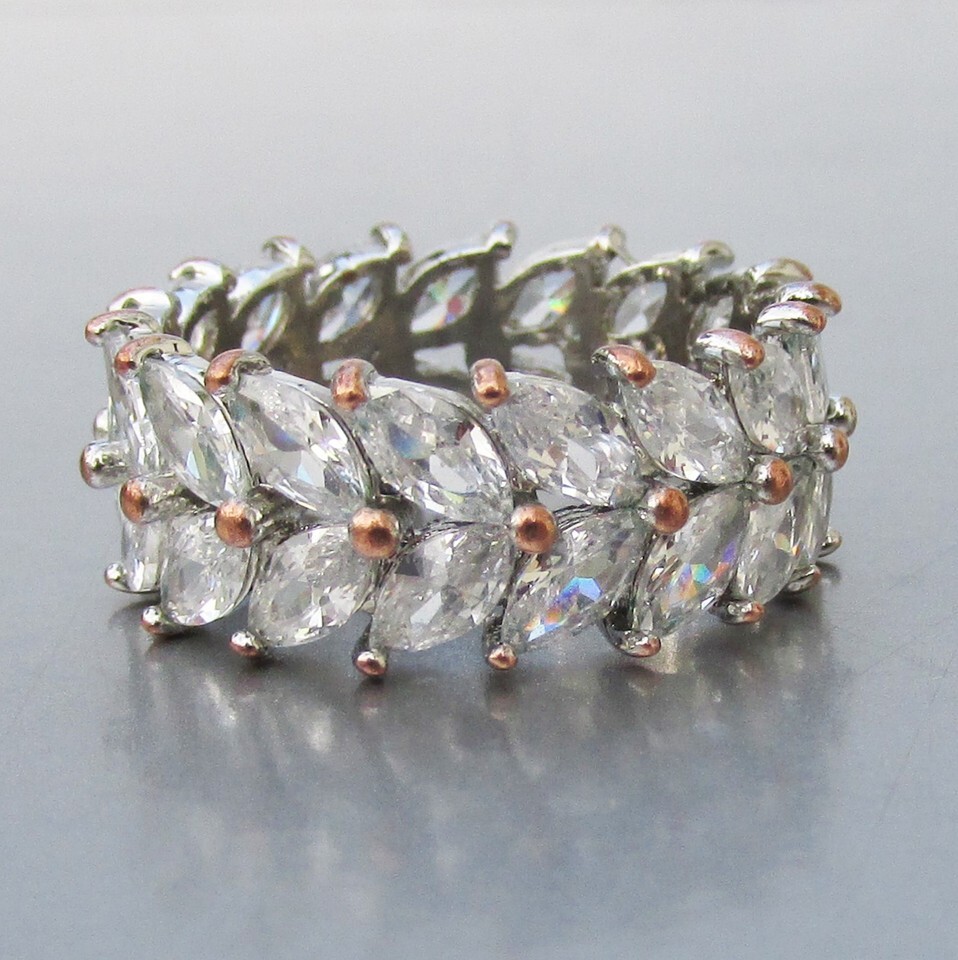 This beautiful 1990s vintage silver tone band ring has two rows a marquise shaped cubic zirconia stones set at an angle with tiny copper dots at the sides and in the center. It is silver-tone metal inside and is size 5. It measures 8 mm wide or 5/16". It is in excellent condition with no wear or damage. It will arrive gift boxed. 2883