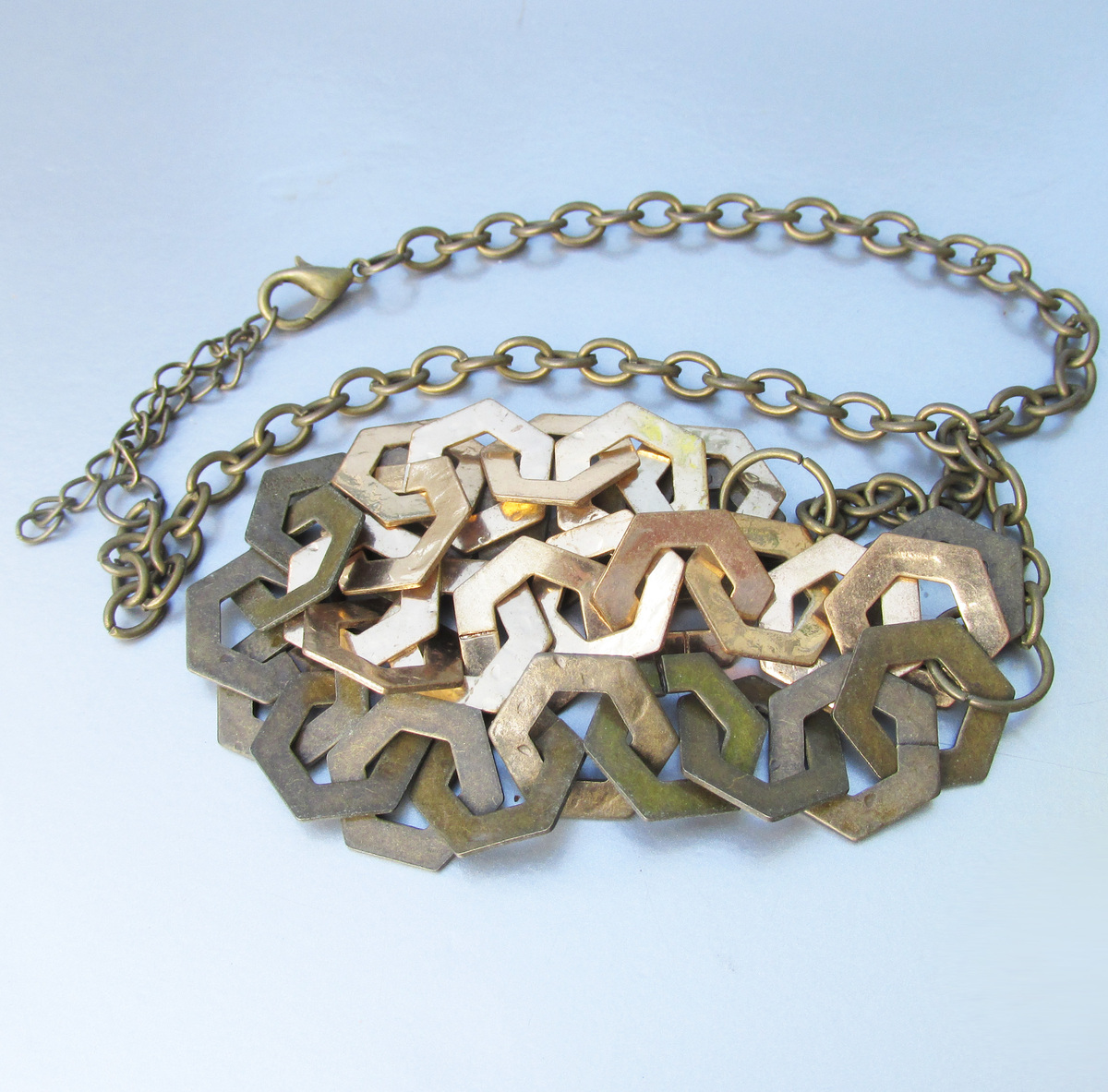 This vintage 1980s brass chain necklace has a two chain center area with large 3/8" wide six sided 3-D links. One strand is shiny gold-tone and is textured on one side, and the other is the dull dark brass which matches the small chains on the sides. It is 18" long plus has a 3" long extender chain and a lobster claw clasp, but you can also clasp it shorter than 18" anywhere along the chain. It is in excellent condition with no wear or damage. It will arrive gift boxed. 3547