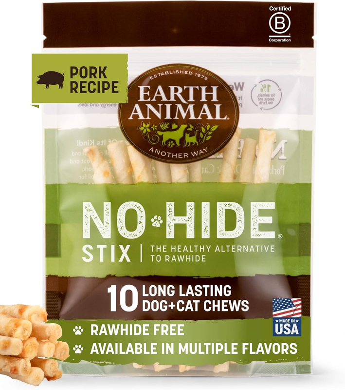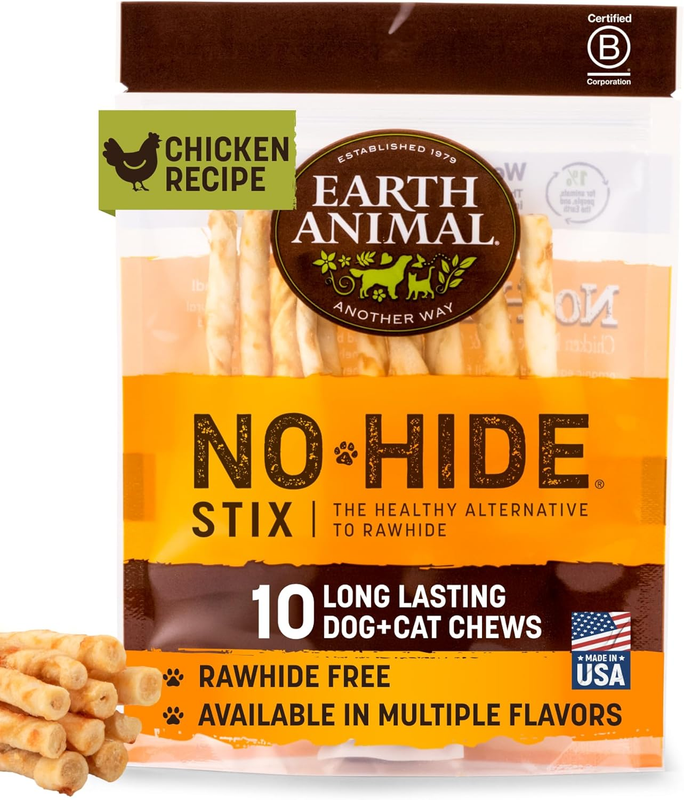 CHEWS FOR CATS SMALL DOGS: No Hide Stix chews are specially crafted for pets under 15 lbs. This 10-pack of rawhide-free treats is made with humanely raised American chicken, delivering a tasty and satisfying chewing experience.