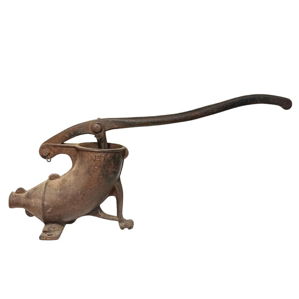This vintage cast iron sausage stuffer/meat press, size #21, measures about 24" x 11.5" and was designed to mount to a board or work surface (board not included). It is stamped ?21? and made of heavy cast iron. The extruder attachment is missing, so it?s offered as-is. Pieces like this were historically used in food preparation and today display well in farmhouse, rustic, or Americana decor.