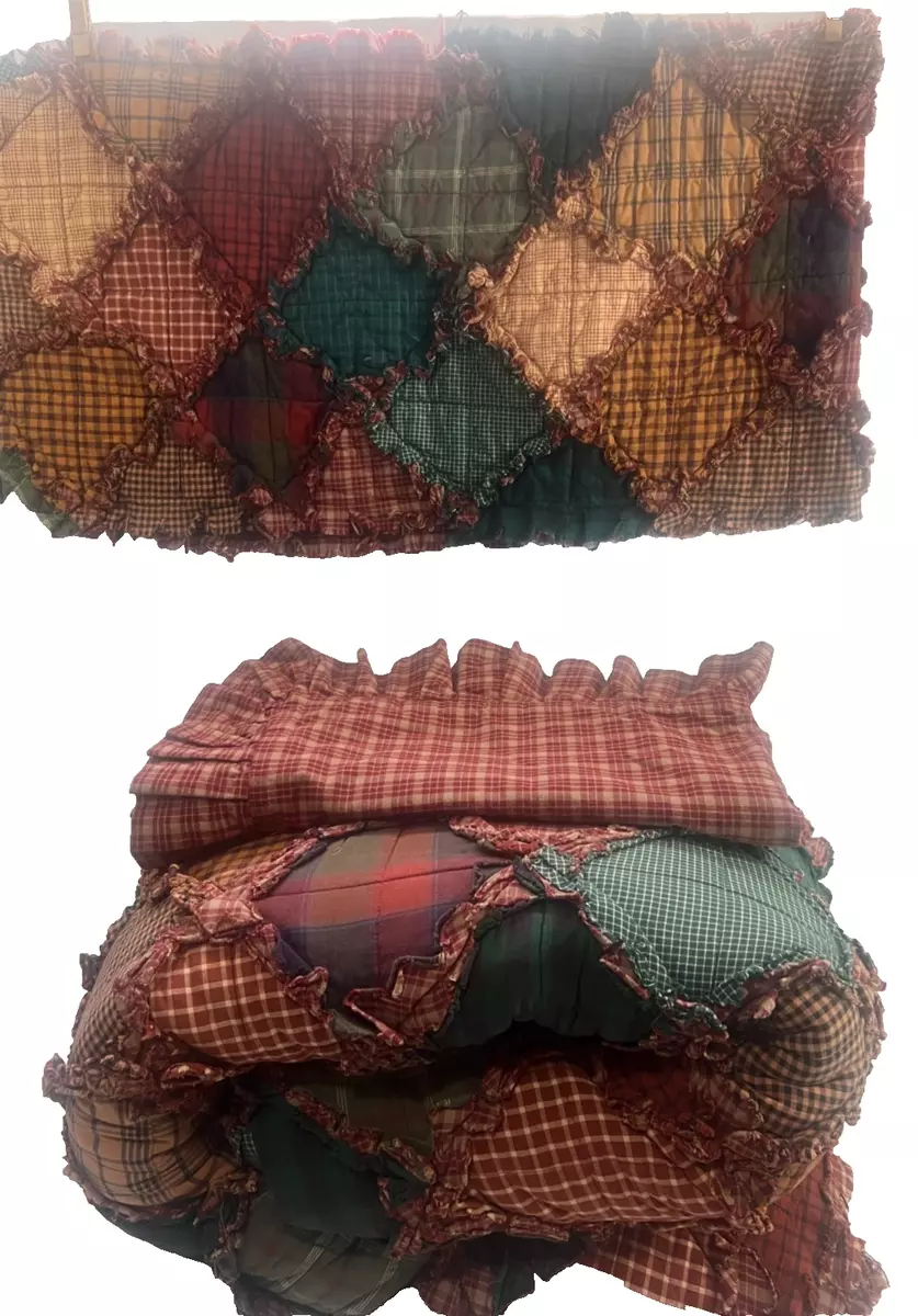 Made of cotton, this rustic collection has patchwork plaid patterns and rag trim edges.