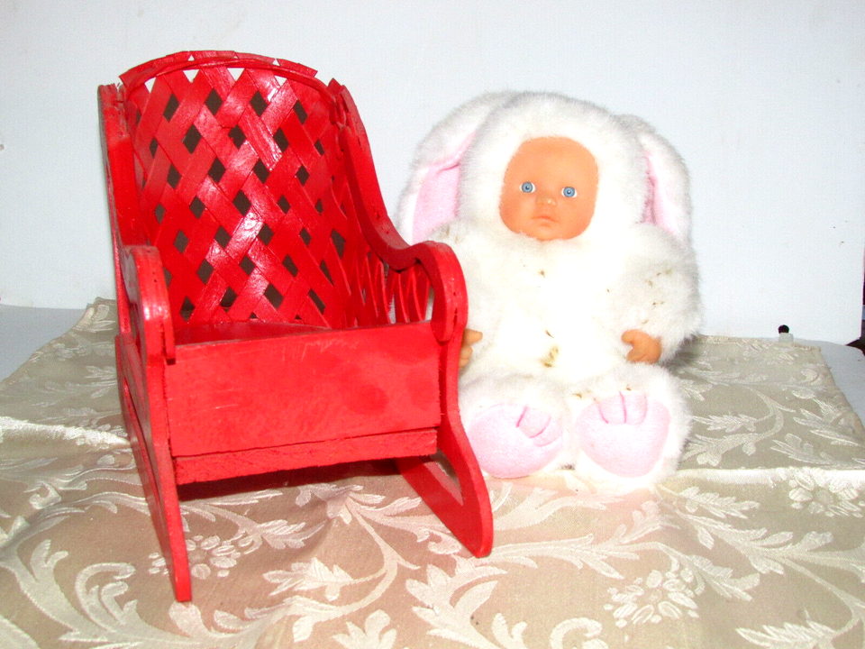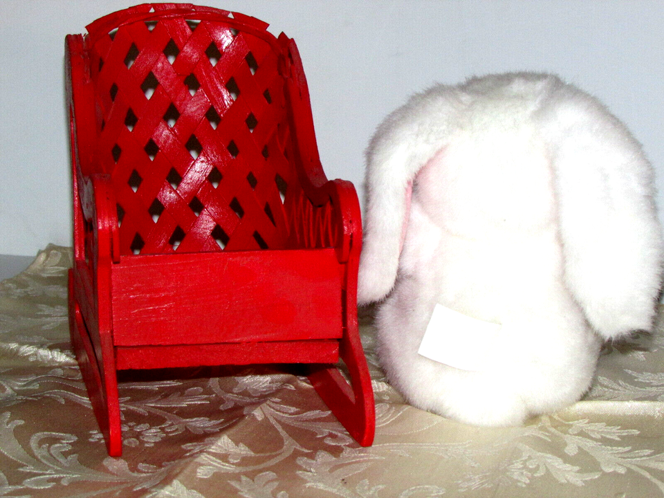 red wooden SLEIGH w/Simba Toys BABY in white RABBIT COSTUME 9x6x9" overall(bdrm)