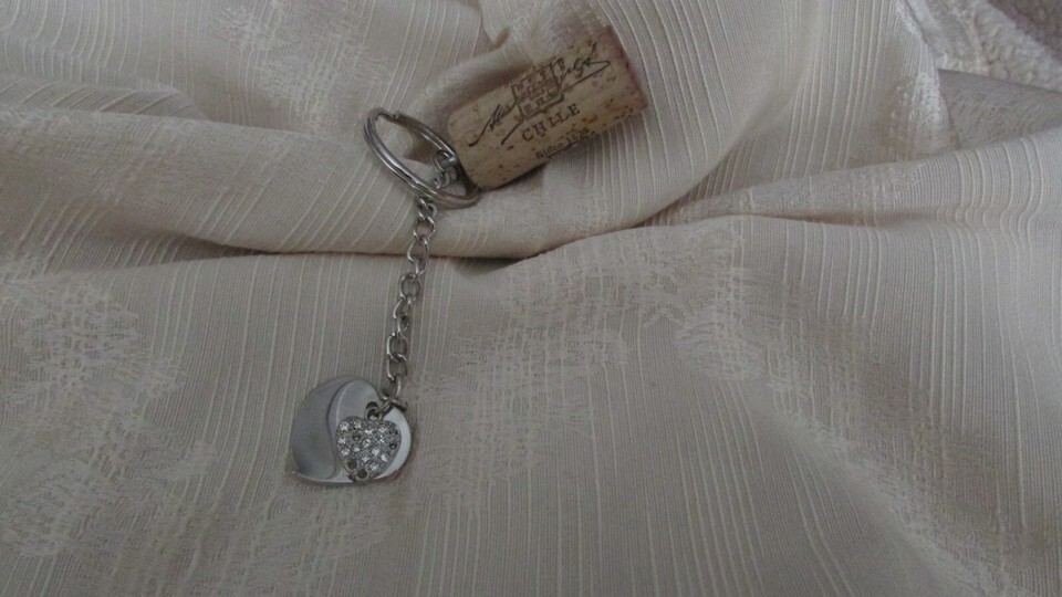 handmade WINE CORK KEY CHAIN w/2 silver color HEARTS some rhinestones (key 4)