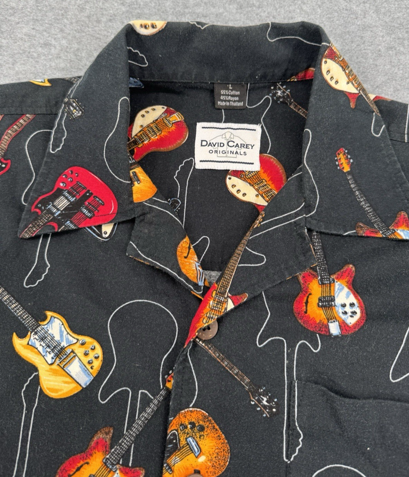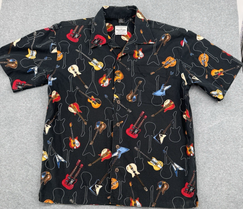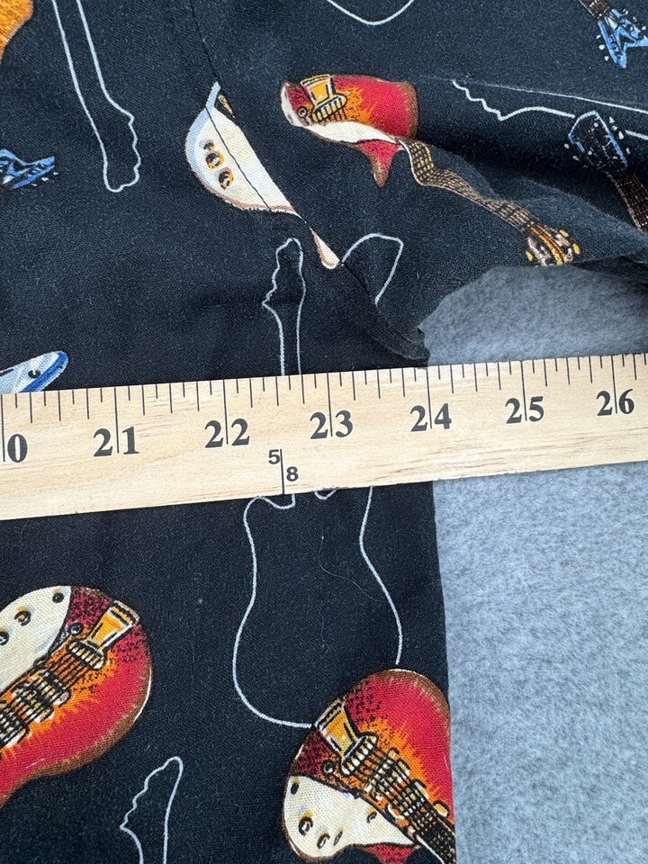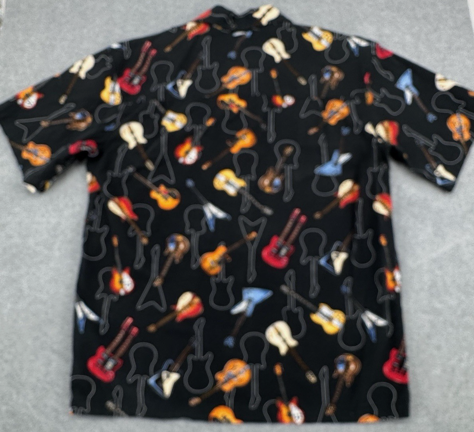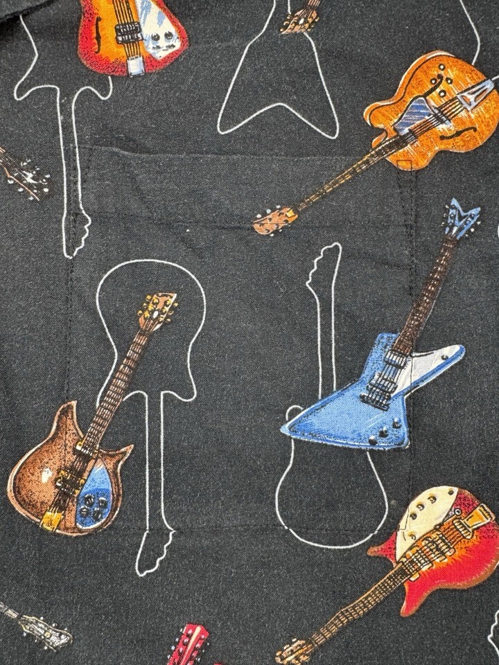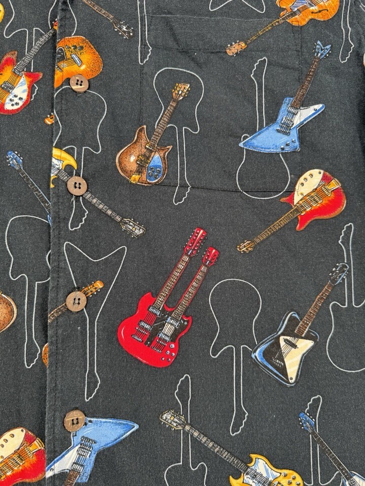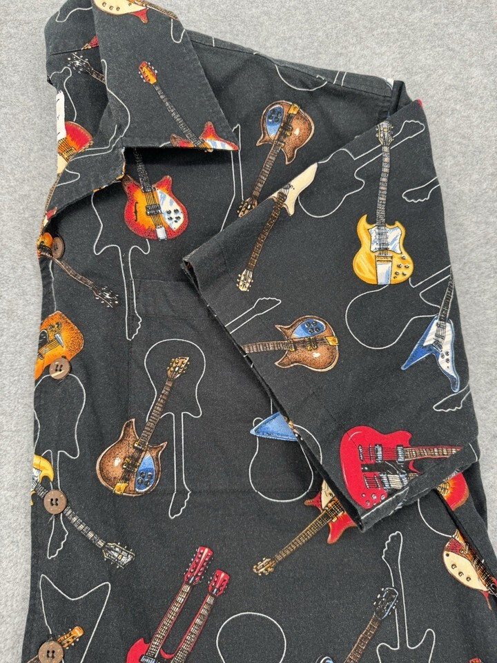 Men’s Electric Guitar Print Button Up Shirt Large Black Short Sleeve Music