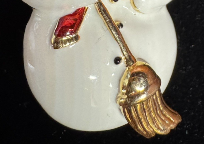Vintage Enamel Snowman Brooch Gold Tone Christmas Holiday Broom Top Hat