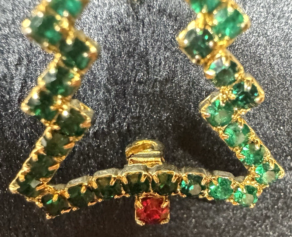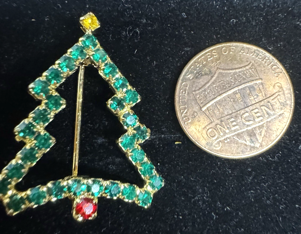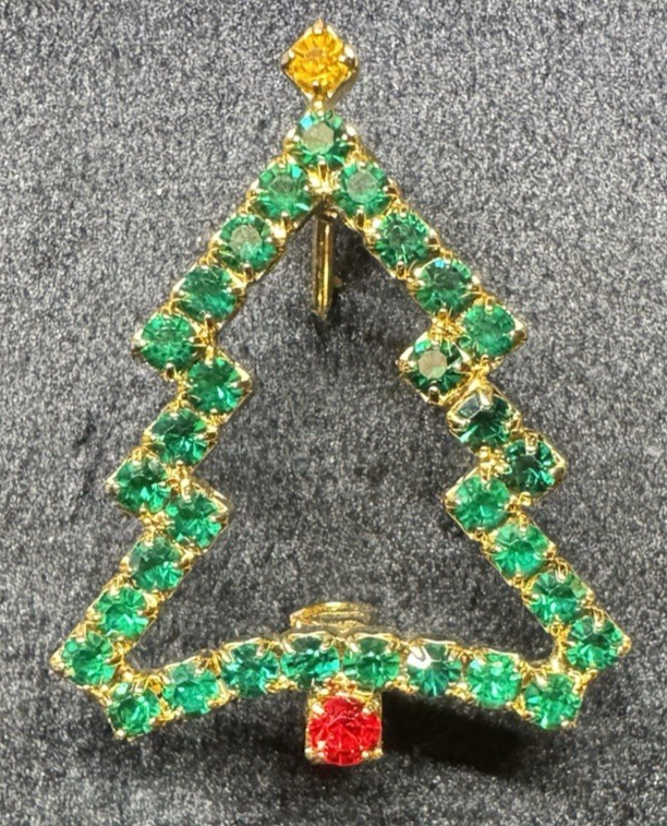 Vintage Rhinestone Christmas Tree Brooch Green Red Gold Tone Holiday Pin