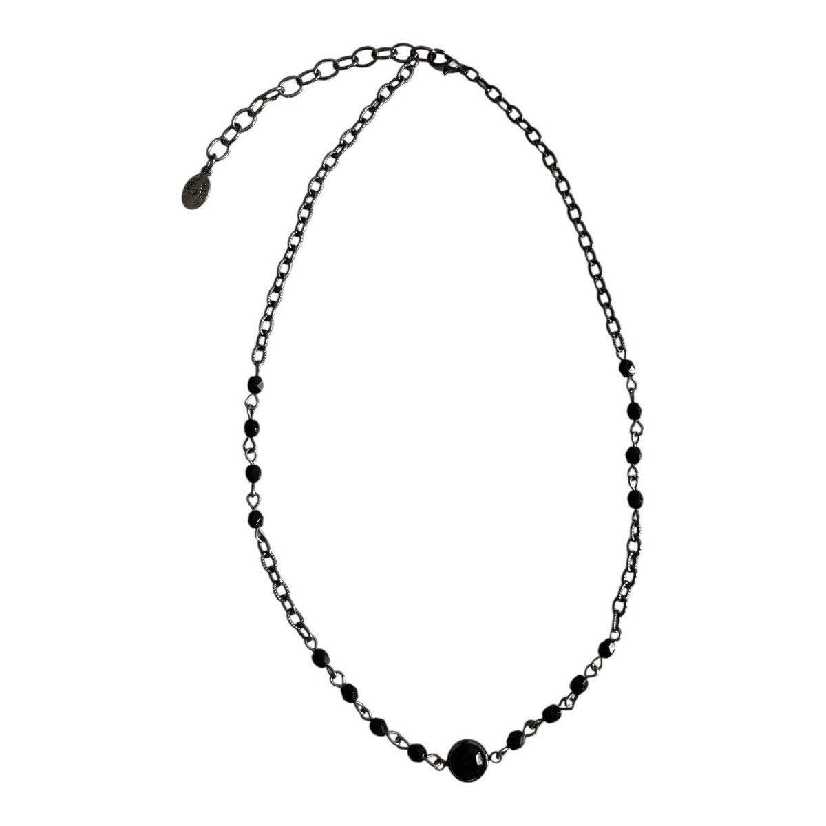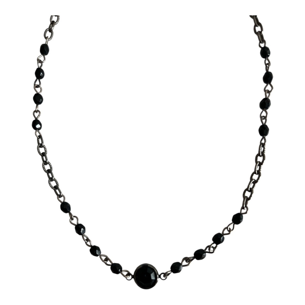 Vintage Robert Rose necklace featuring faceted black crystal beads set along a gunmetal tone chain with a larger round center crystal accent. The darker metal finish gives the piece a sleek, modern look that fits well with minimalist, Y2K, or evening styling.