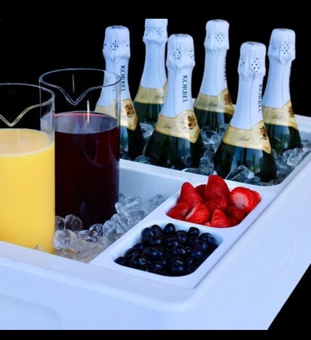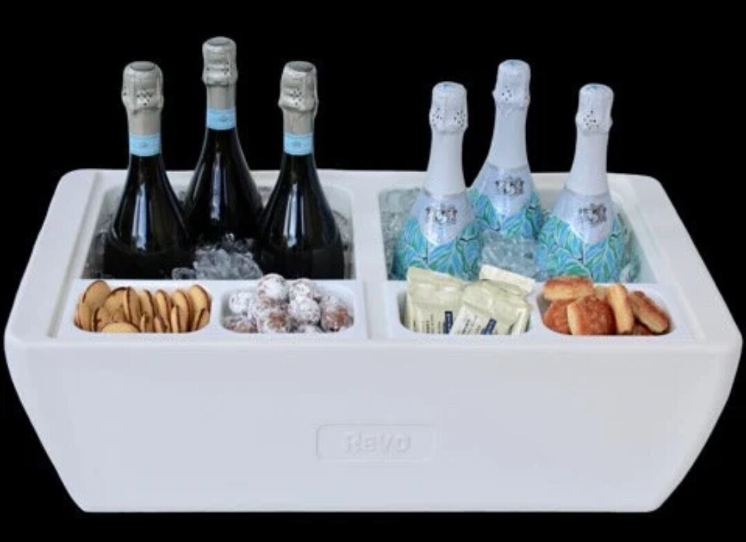A fun and incredibly versatile party cooler with premium insulation. Beverage displays are visible and easily accessed without digging through ice. An ice scoop is included for use as an ice bucket and the condiment trays provide plenty of display options. Each compartment fits a 1/2 size food pan and it also comes with 2 lids. From mimosa bars to taco bars, guests will love the inviting presentation. Premium insulation means no condensation mess and it can be used indoors or outdoors. It can also be used with chill boards or with heat packs as a flameless chafer, making it the most versatile party cooler for all events