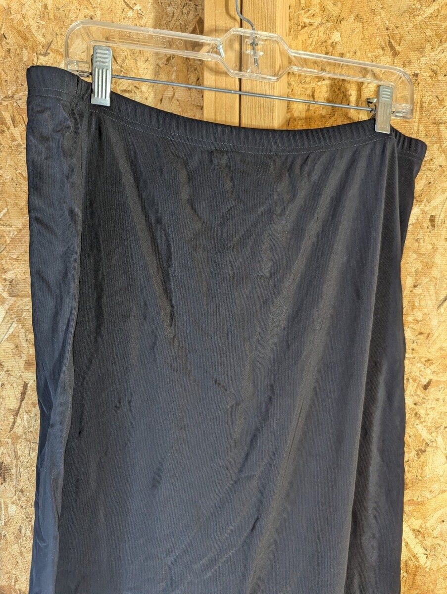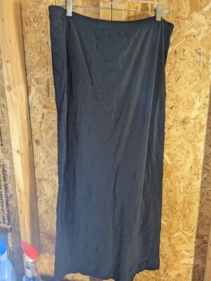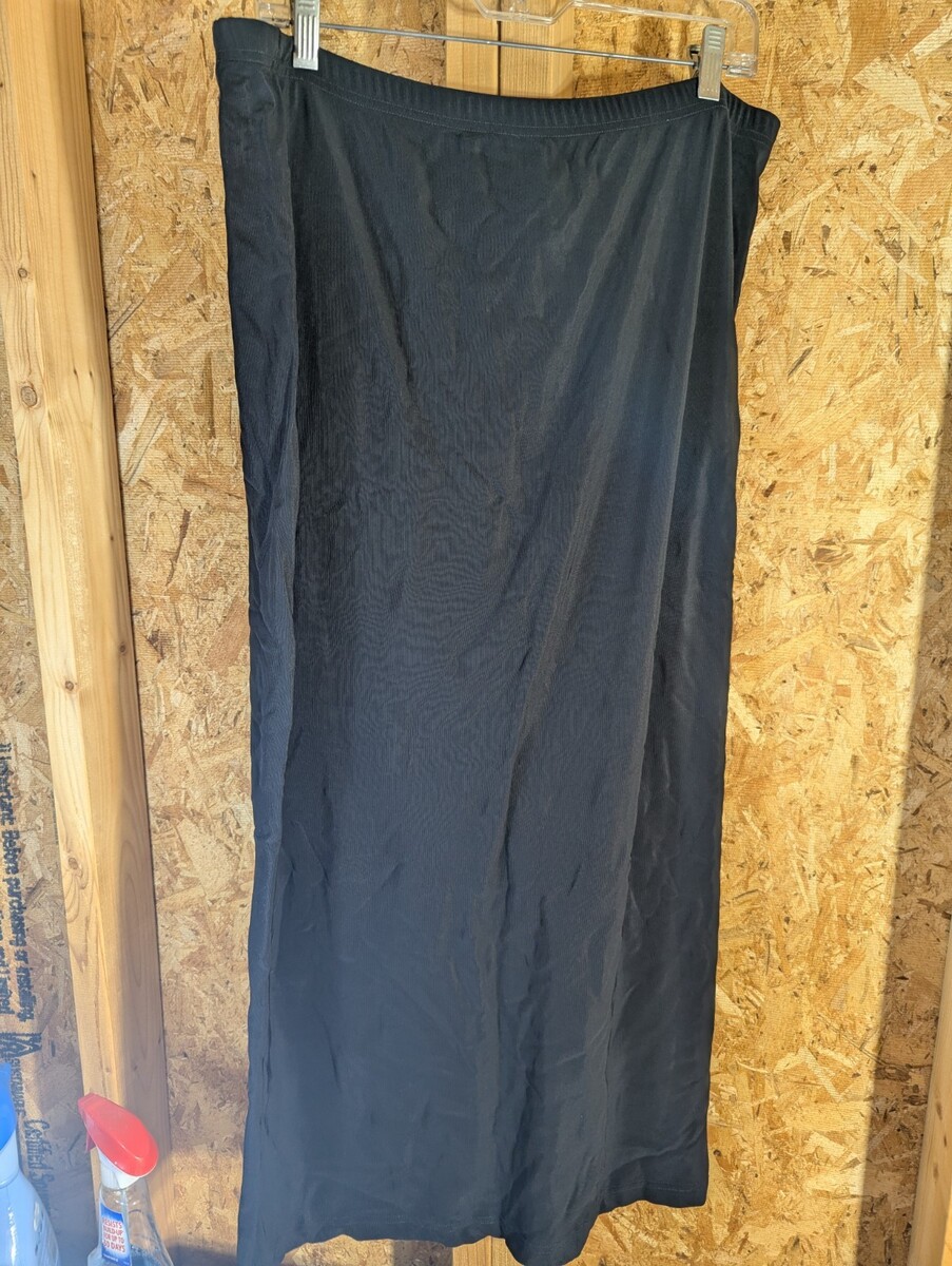 The Rafael 2X Nylon Blend Black Skirt is a versatile and elegant piece perfect for various occasions such as weddings, parties, casual outings, formal events, and business meetings. This A-Line skirt features a solid black color with a pullover closure and an elastic waist for a comfortable fit. Made from a lightweight and stretchy nylon blend fabric with spandex, it offers a flattering silhouette for plus-size women. Ideal for all seasons, this long skirt is a timeless addition to any wardrobe. Hand wash only to maintain its quality. Made in the United States by the brand Rafael. 36" waist and 36" length