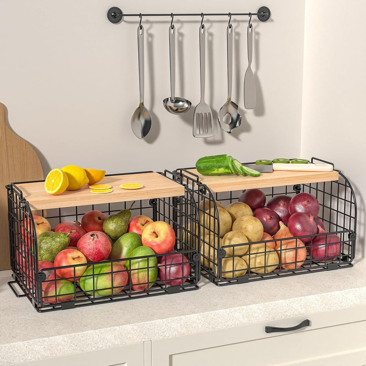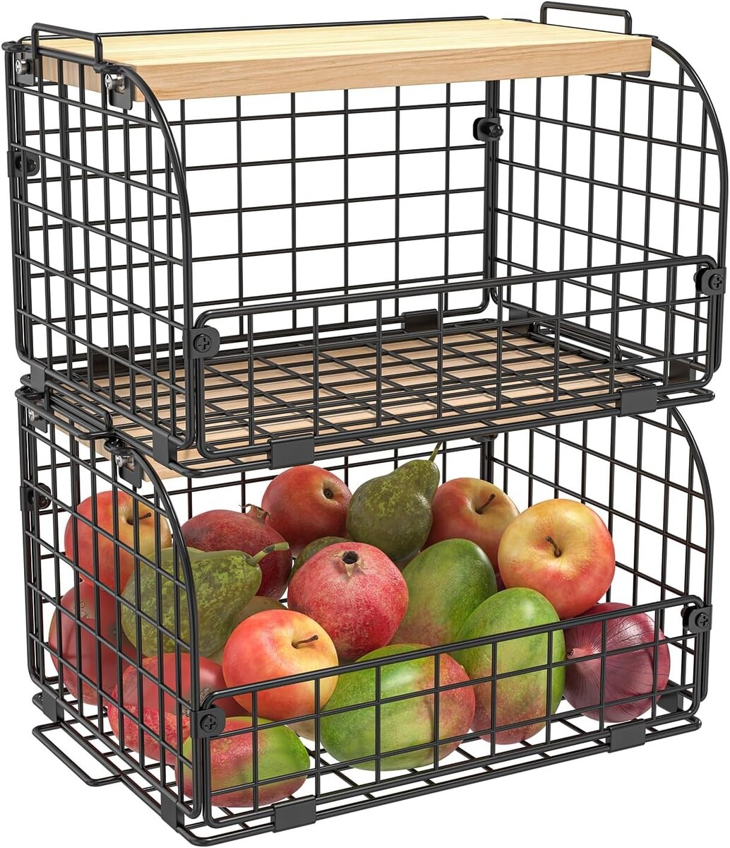 Farmhouse Style Stackable Wire Baskets - Openable Top for Kitchen Organization