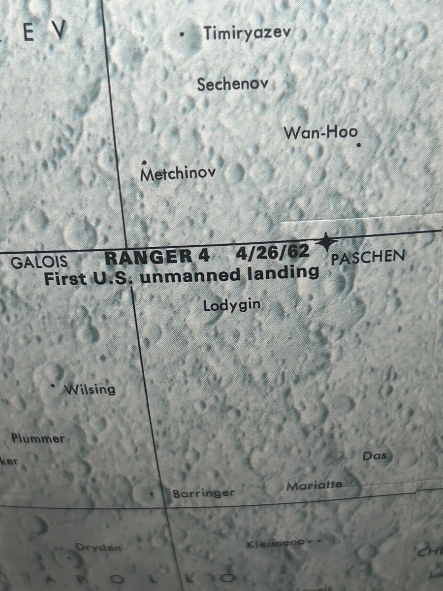 ? Mission Markers: Features early lunar exploration milestones, including Lunik 2 (First unmanned landing, 9/13/59) and Ranger 4 (4/26/62).