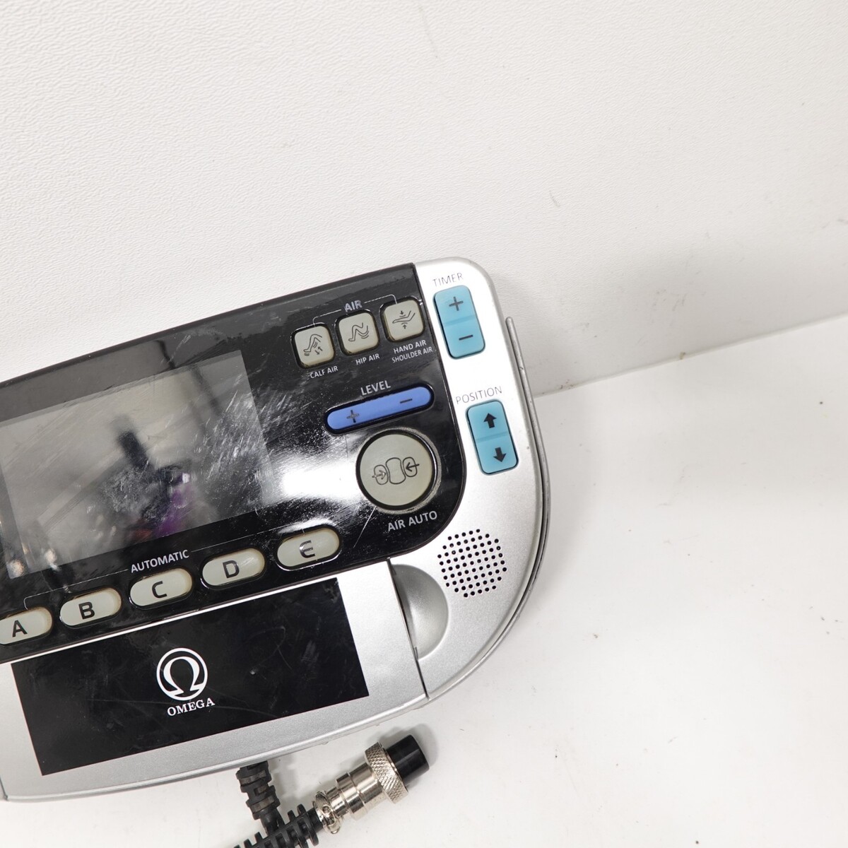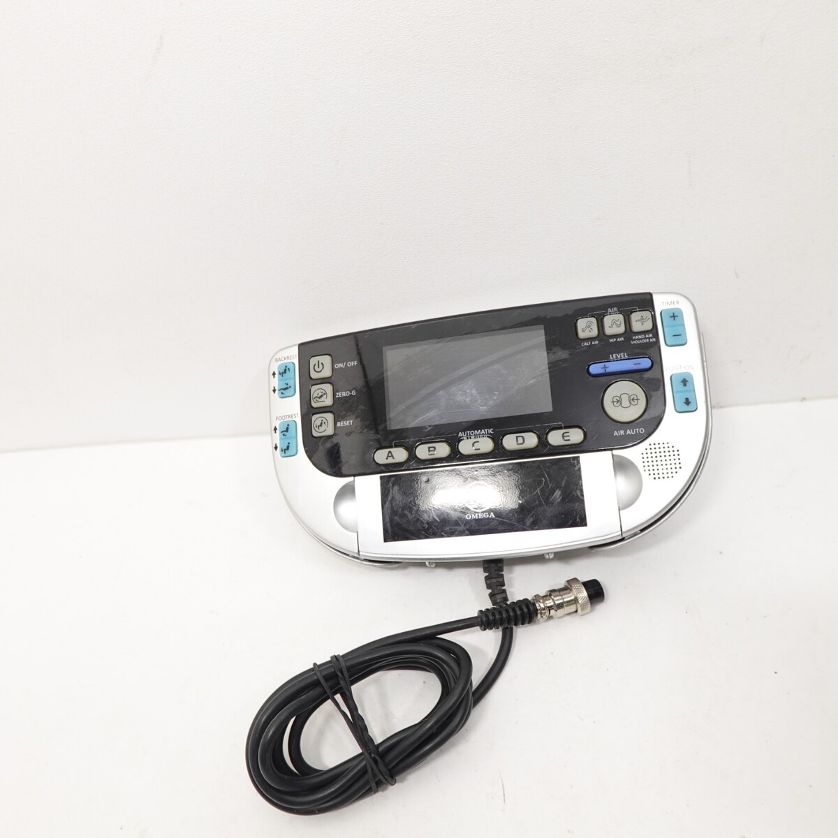 Genuine Omega massage chair wired remote control panel with attached cable and locking connector.