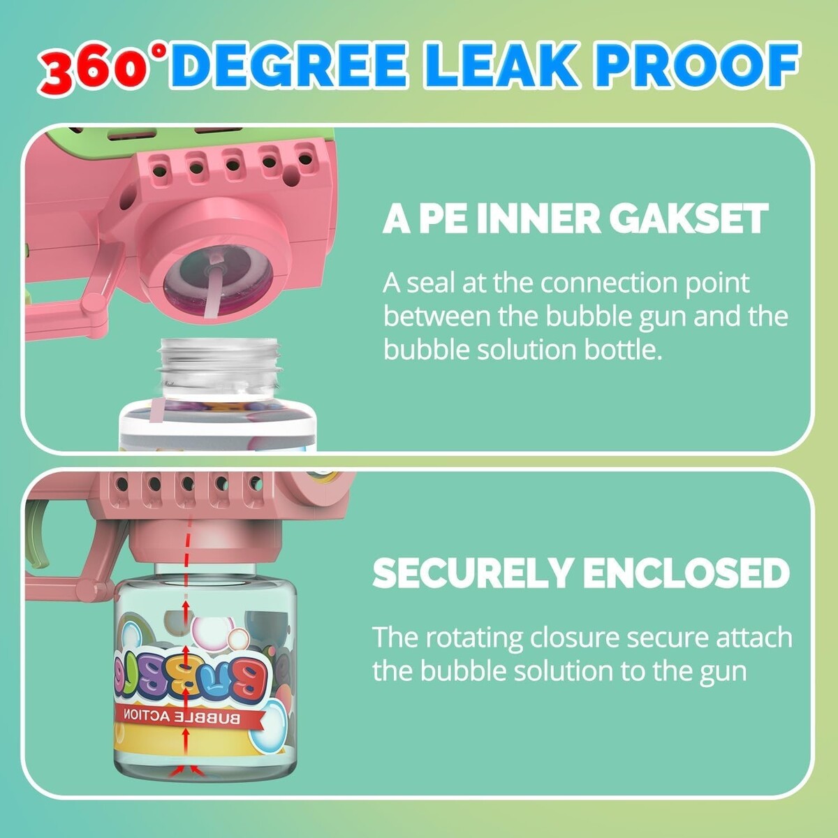 Leak-Proof Mess-Free: Our innovative 360 leak-proof system with a PE gasket allows for carefree play. No spills or sticky patches on your grass or patio?just endless bubble-blasting joy!