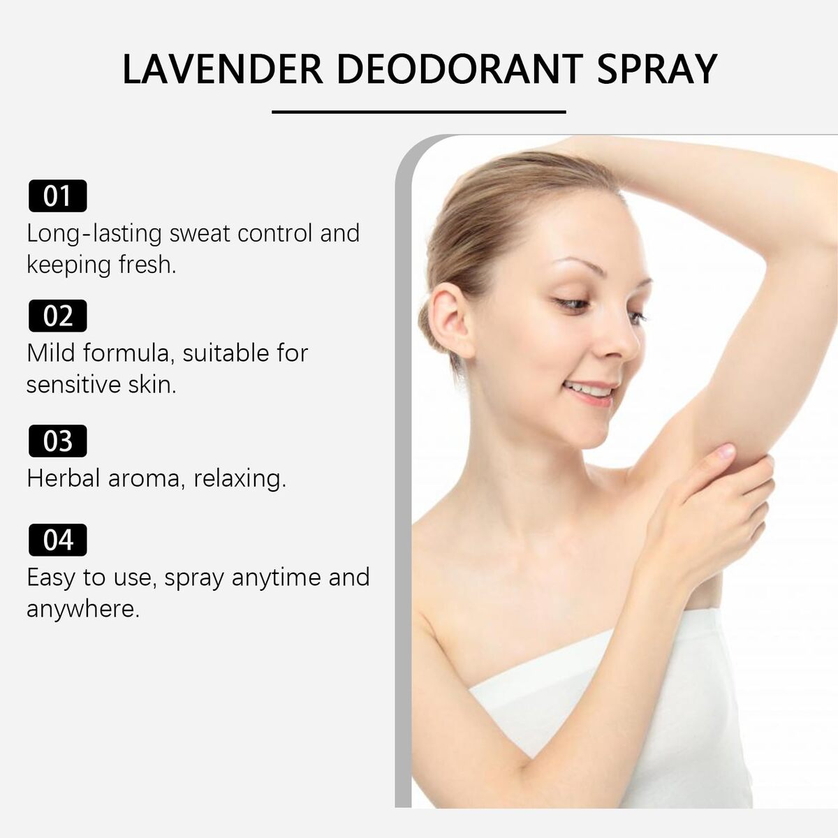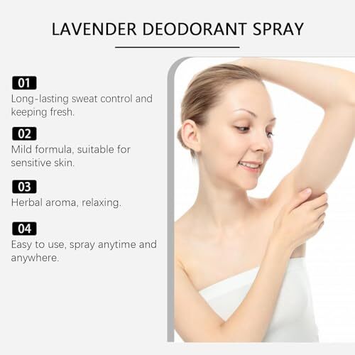 Infused with lavender extract and natural plant ingredients, this deodorant spray delivers a soft herbal fragrance that refreshes the skin while creating a relaxing aromatic experience. The pleasant lavender scent helps maintain a naturally fresh feeling all day.