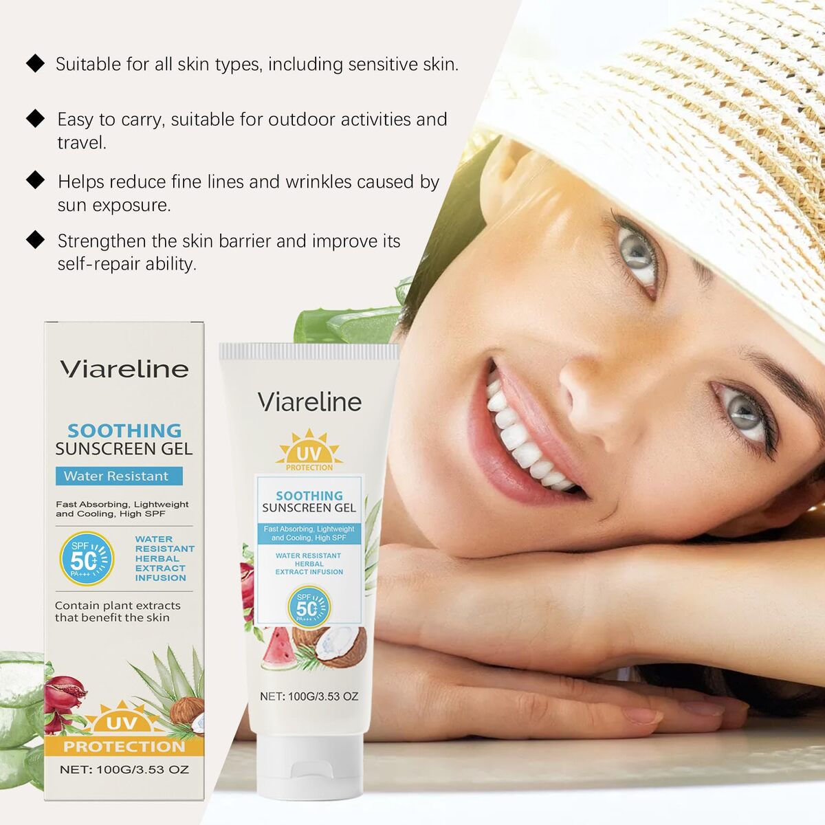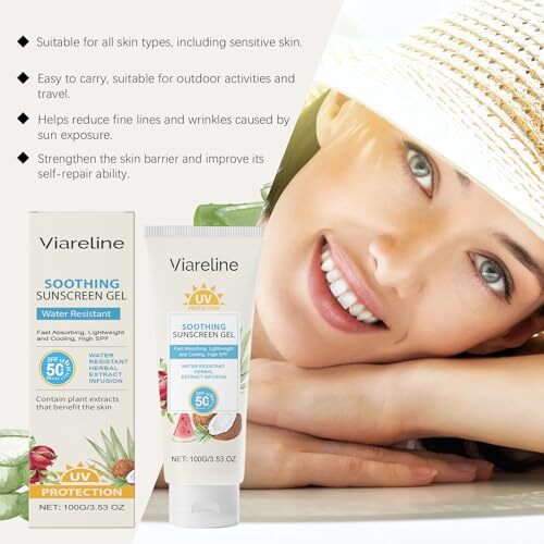 Short product description: Viareline SPF 50 Soothing Sunscreen Gel provides lightweight, broad spectrum protection from UVA and UVB rays for everyday sun care. The refreshing gel formula absorbs quickly into the skin without leaving a heavy or greasy feel. Enriched with niacinamide and aloe leaf extract, it helps maintain a comfortable and hydrated skin feel during daily sun exposure. Suitable for a wide range of skin types, this sunscreen gel comes in a convenient 100g (3.53 oz) tube that is easy to carry for travel, outdoor activities, and everyday use.