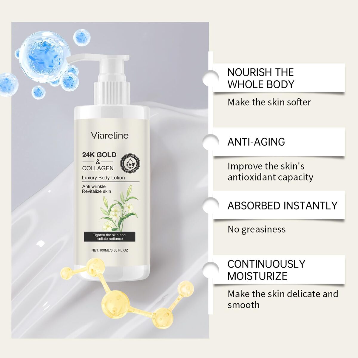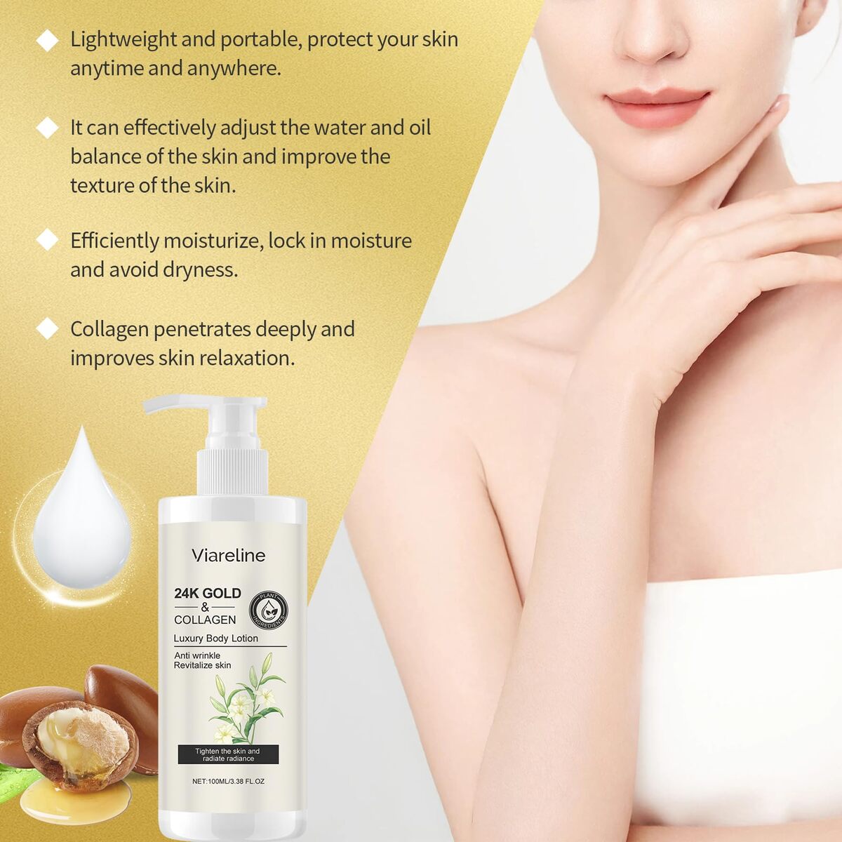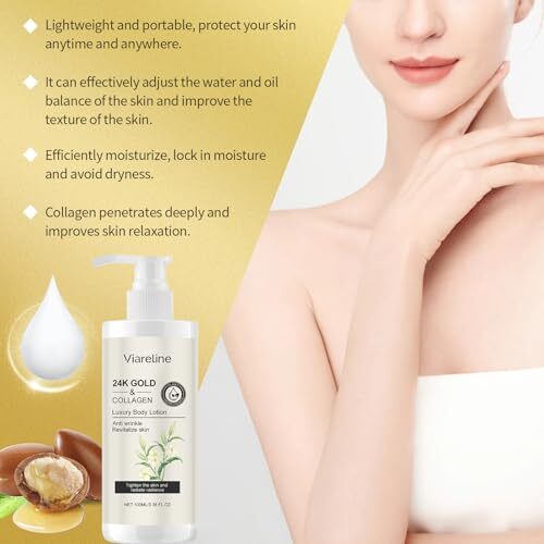 Short product description: Viareline 24K Gold Collagen Luxury Body Lotion provides a rich moisturizing experience designed to keep skin feeling soft, smooth, and refreshed. The lightweight, fast-absorbing formula blends nourishing ingredients such as collagen and glycerin to help maintain skin hydration without leaving a greasy residue. Suitable for all skin types, this elegant body lotion delivers everyday moisture care with a smooth, comfortable feel. The convenient 100ml (3.38 fl oz) bottle makes it easy to enjoy luxurious skincare at home or on the go.