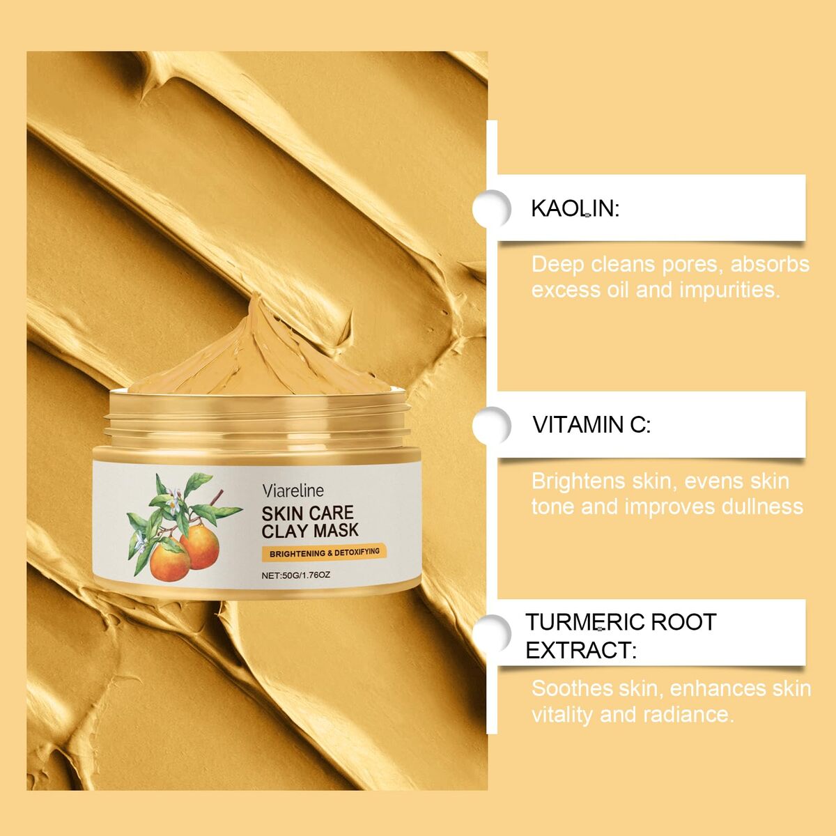 Short product description: Viareline Vitamin C Turmeric Clay Mask is a deep-cleansing facial treatment designed to help purify pores and refresh the complexion. Formulated with Kaolin and Bentonite clay, it helps draw out excess oil and impurities while Vitamin C and Turmeric support a brighter, healthier-looking glow. This lightweight mud mask leaves skin feeling smooth, balanced, and revitalized after every use.