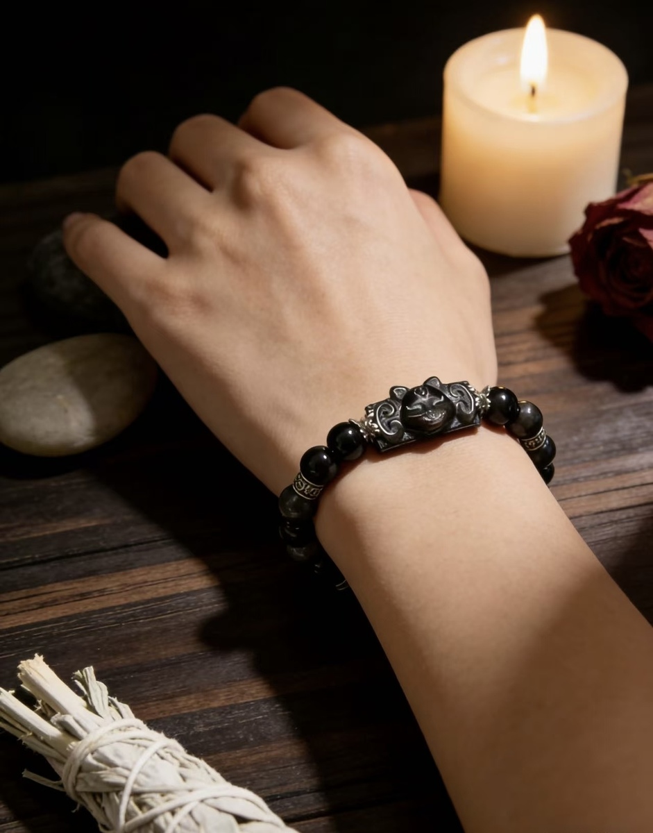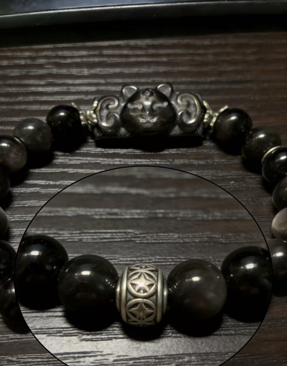 This bracelet features natural 8mm Silver Obsidian beads paired with a beautifully carved Fox guardian charm (25mm 10mm). The fox is surrounded by intricate scroll metalwork, creating a piece that is both bold and deeply meaningful.
