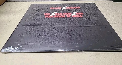 This is a very rare and sealed 1st press vinyl LP by Black Sabbath, titled "We Sold Our Soul for Rock n' Roll". The record features 33 RPM speed and is on the Warner Bros. record label. The LP is in a cardboard sleeve and has a black color, with a mint (M) record grading and excellent (EX) sleeve grading.