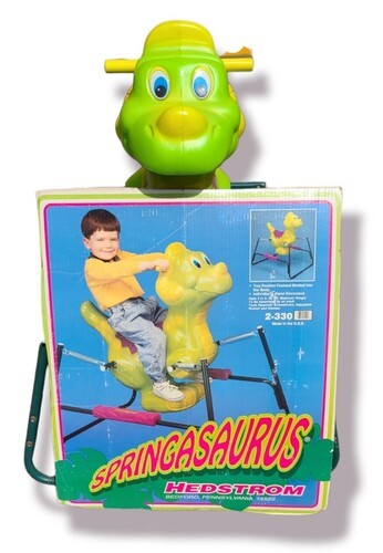 Vintage Hedstrom Springasaurus Dinosaur ride on Spring Bounce Toy EXTREMELY RARE. Cannot find another like this anywhere online. In very good working condition. Springs are tight and not rusty. Minor wear on saddle area as shown. Disassembled for shipment. Comes with front of cardboard box that has been cut out.