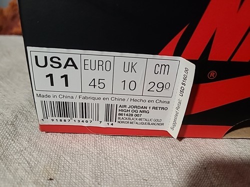 These sneakers come in a UK shoe size of 10, US shoe size of 11, and EU shoe size of 45. The style code is 861428-007 and the model is Air Jordan 1. These sneakers are not customized and are a perfect addition to any collection. Get ready to step up your game with these Air Jordan 1 Retro OG NRG High Gold Toe sneakers.