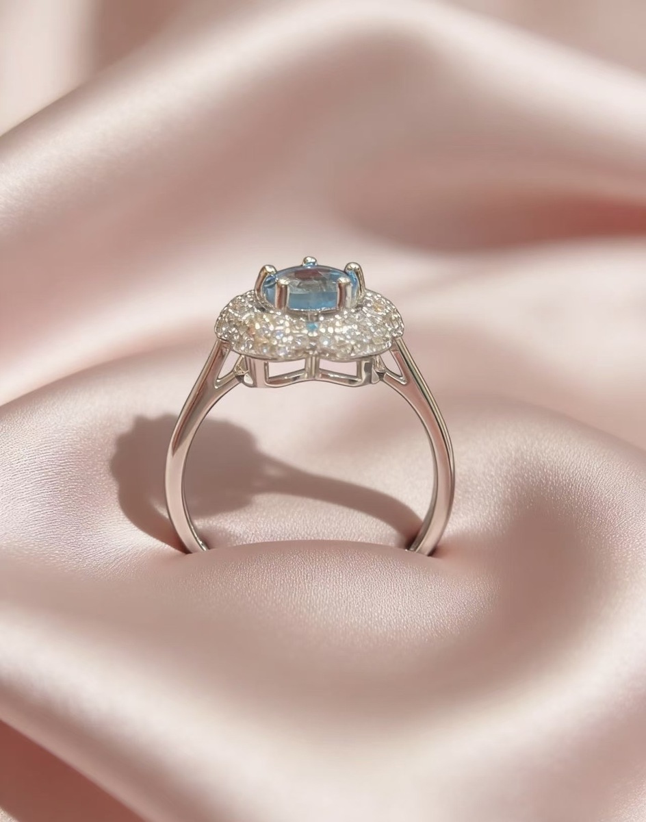 ? Materials · Center stone: Natural Swiss Blue Topaz, round cut, 6mm · Accent stones: CZ (Cubic Zirconia) · Band: 925 Sterling Silver · Setting: Prong set center, pavé CZ halo