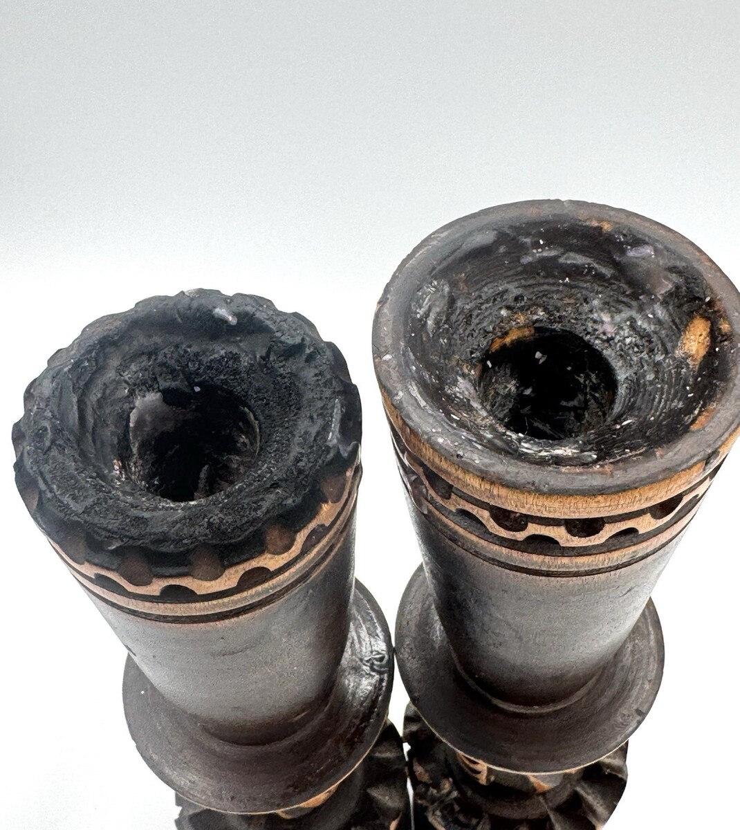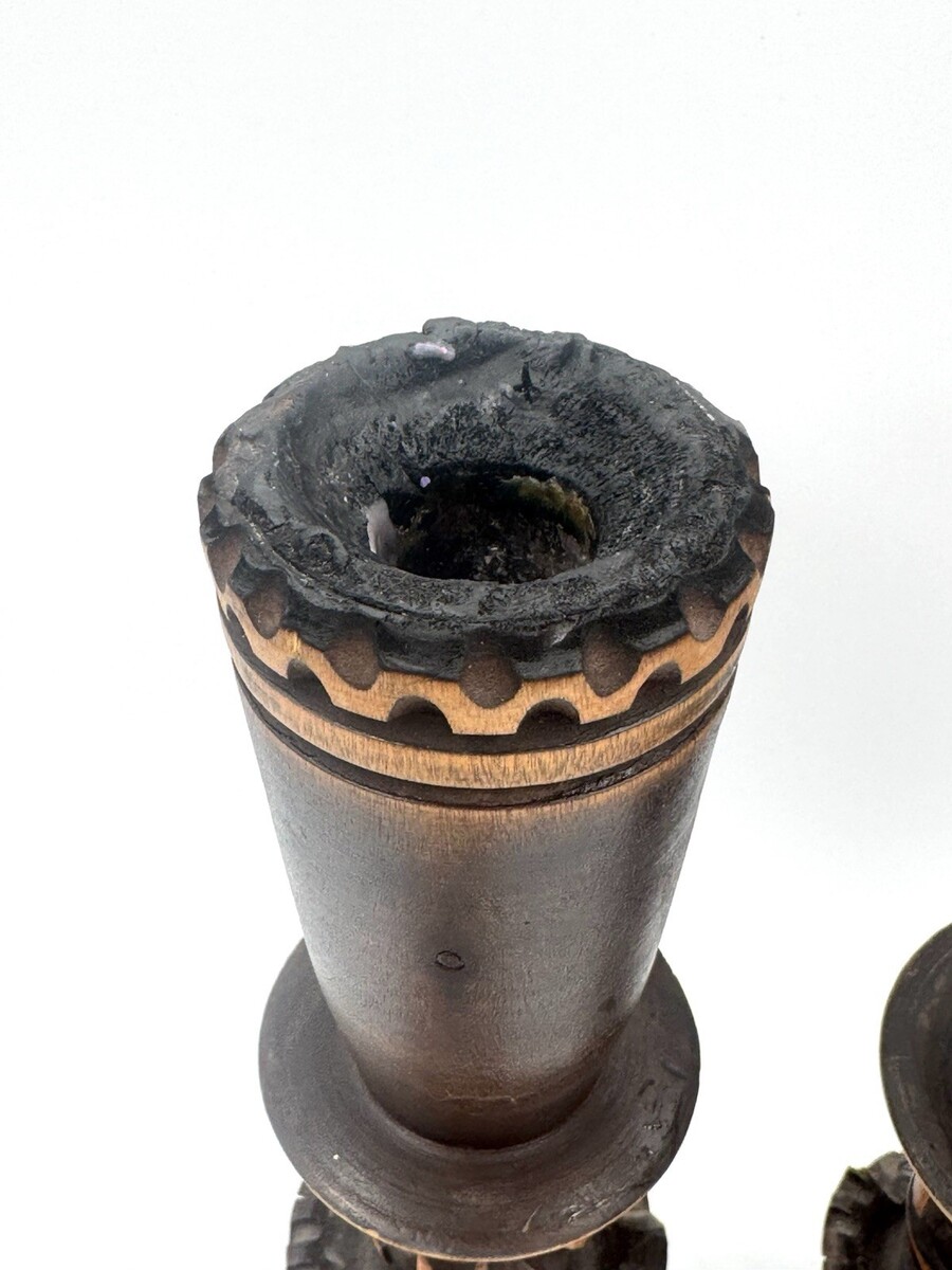Used candlesticks that show some age and use but the only major issue is that the top of one the candlesticks was burned and blackened. The photos are useful for seeing condition and other details. Photos are of the actual item you will receive.