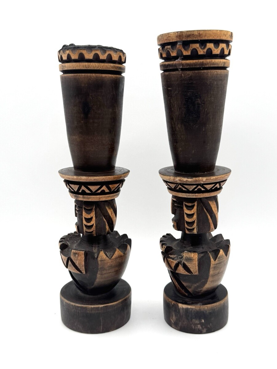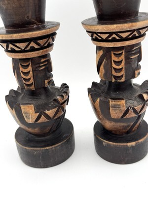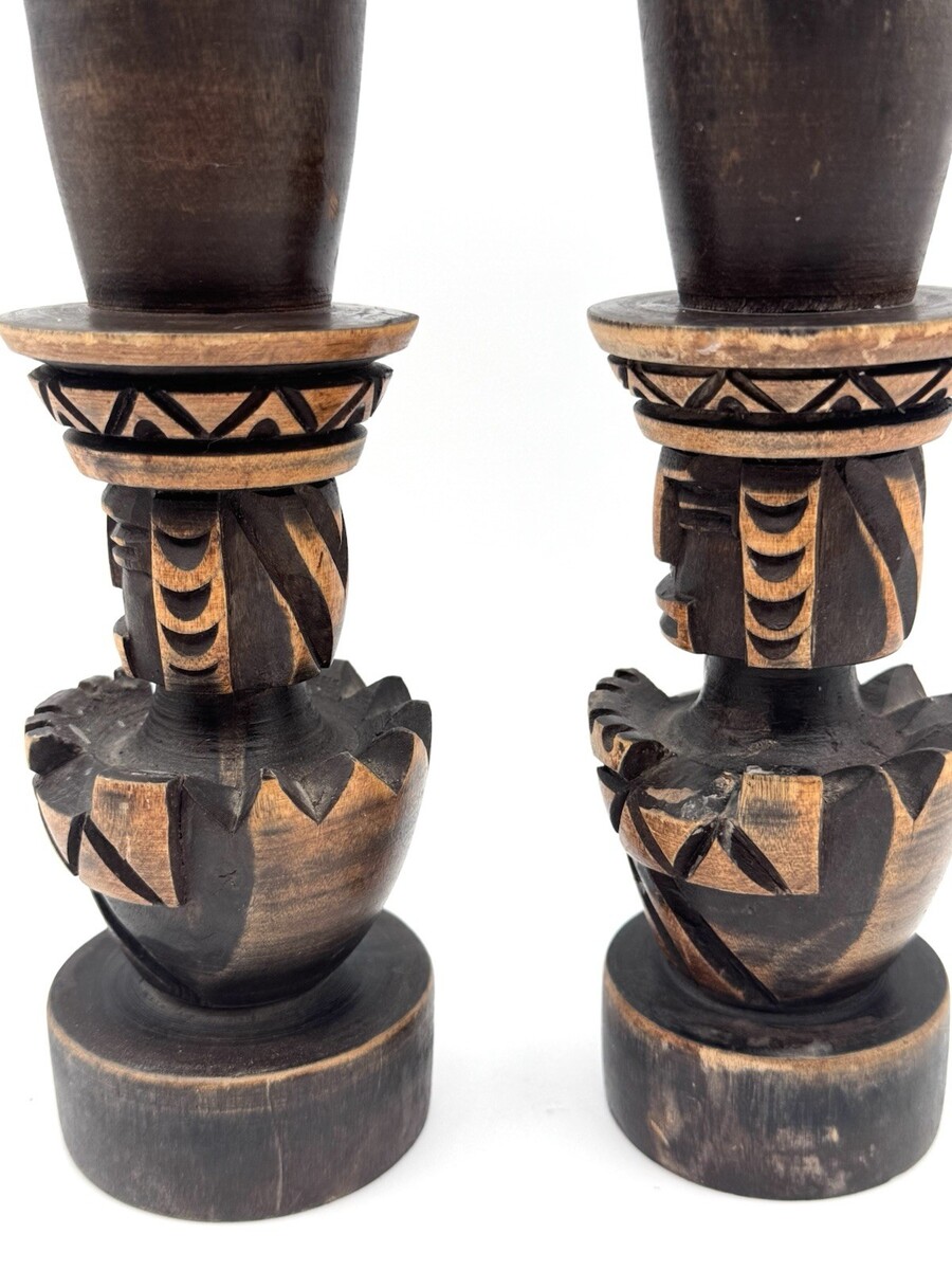 Vintage Hand Carved Wood Tiki Totem Candlesticks 2 Polynesian Taper Holders READ