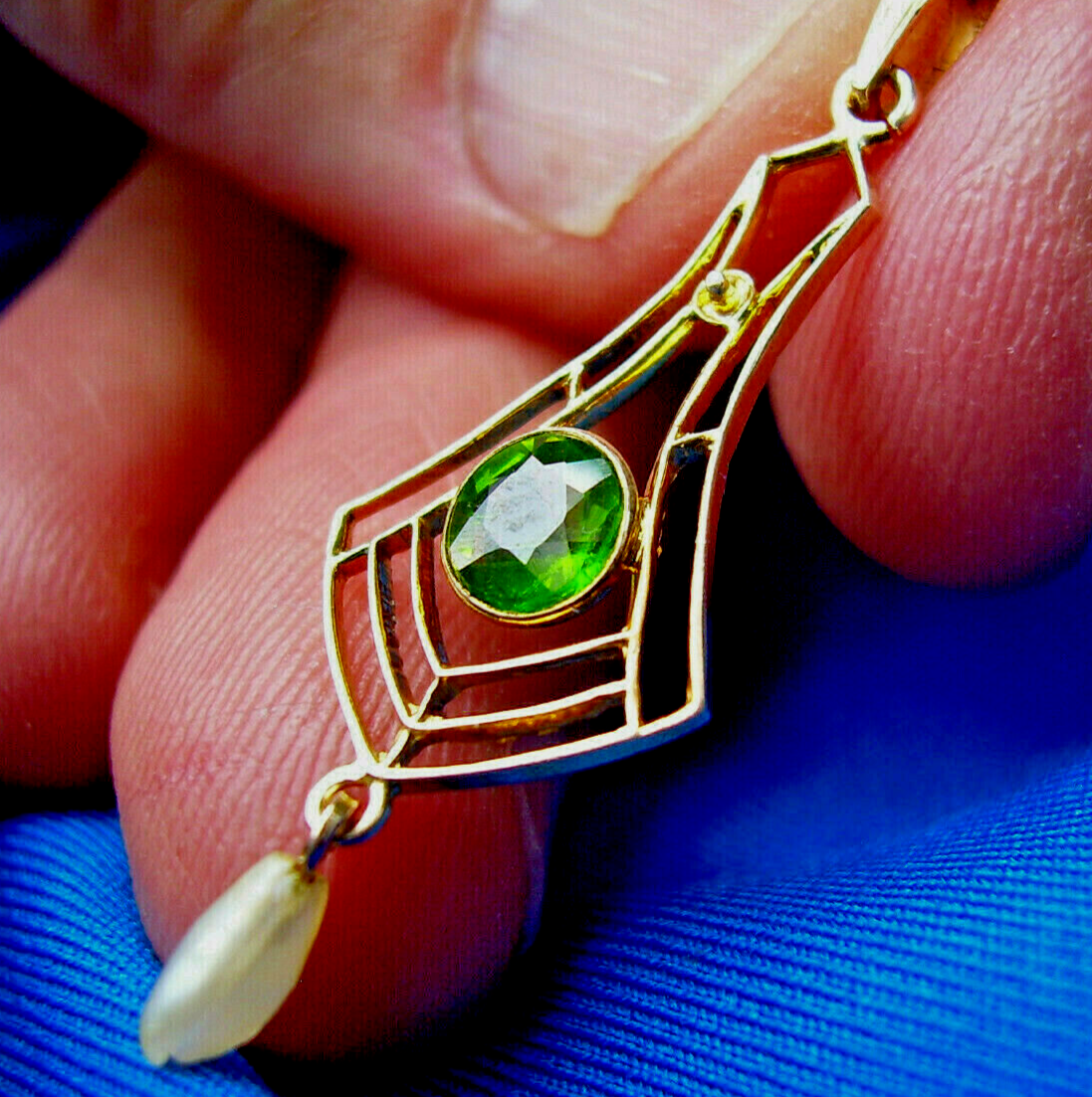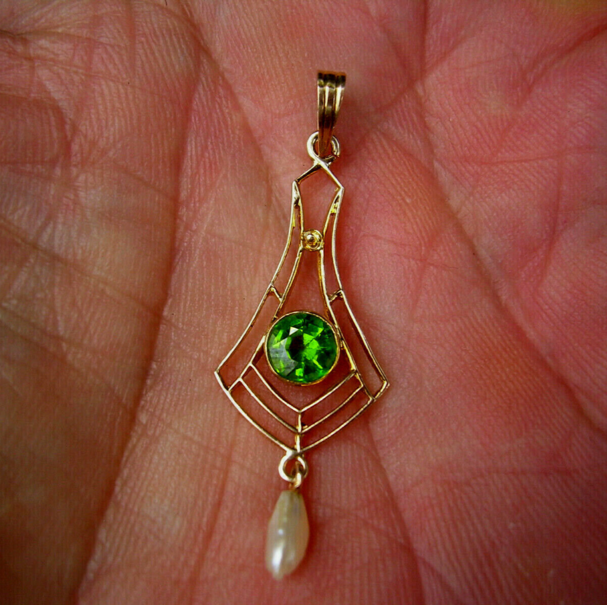 Elegant original deco geometric Gatsby era design peridot and pearl gold charm.