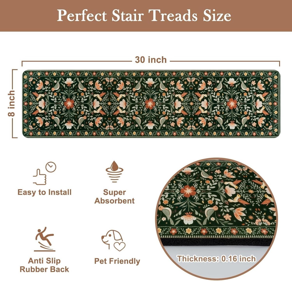 Reliable anti-slip rubber backing ensures secure placement on stairs.