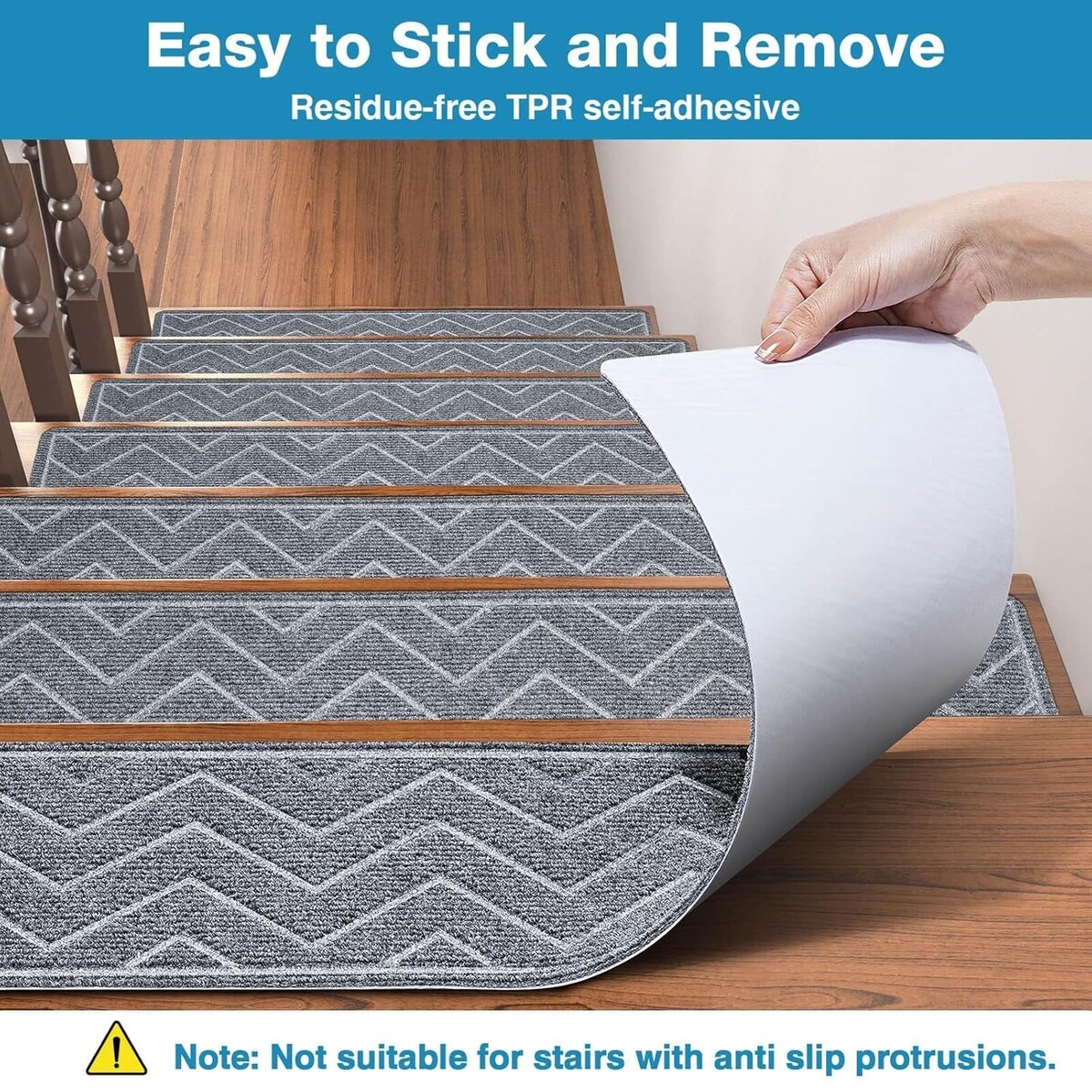 Self-adhesive TPR backing allows for easy repositioning without leaving behind any sticky residue, protecting your stairs.