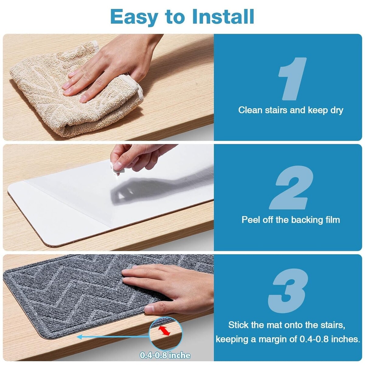 Installed in just 3 easy steps: Clean stairs, peel off backing, and press to apply ? no tools or glue needed!