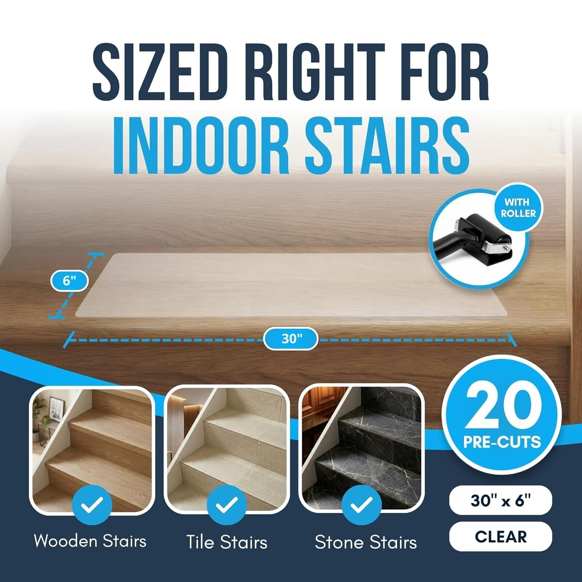 Secure & Stylish 30” x 6” Clear Non-Slip Stair Treads - 20 Pack for Wooden Steps