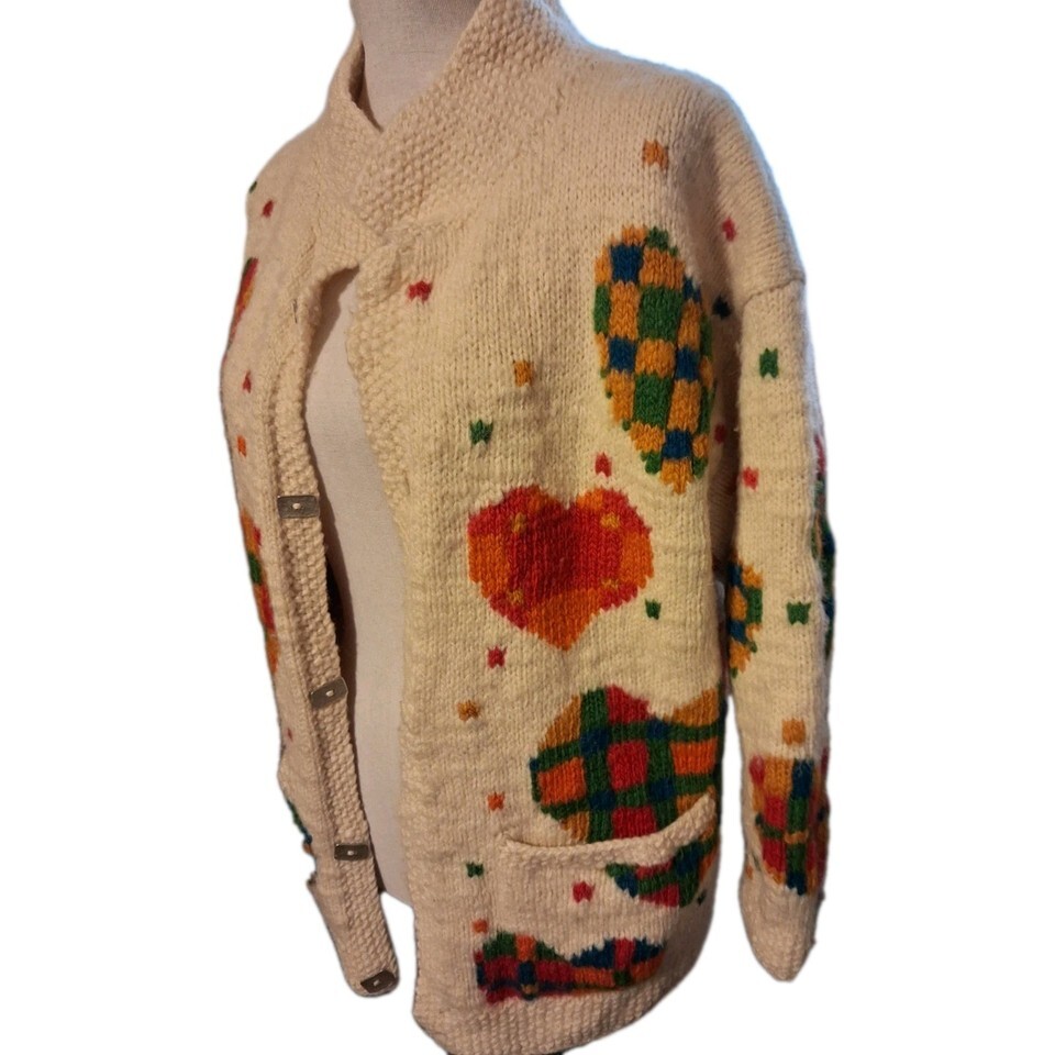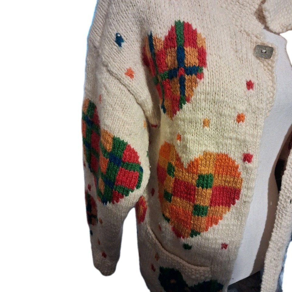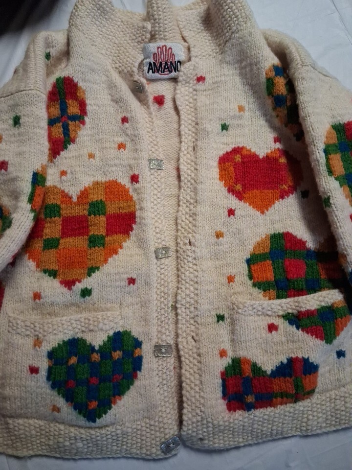RARE Vintage Amano 100% Wool Hand Knitted Chunky Plaid Hearts Cardigan