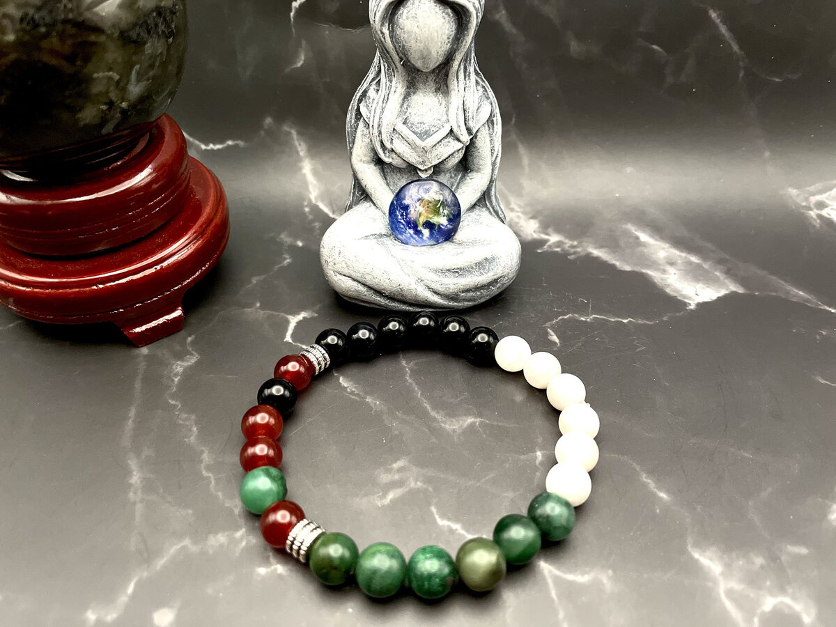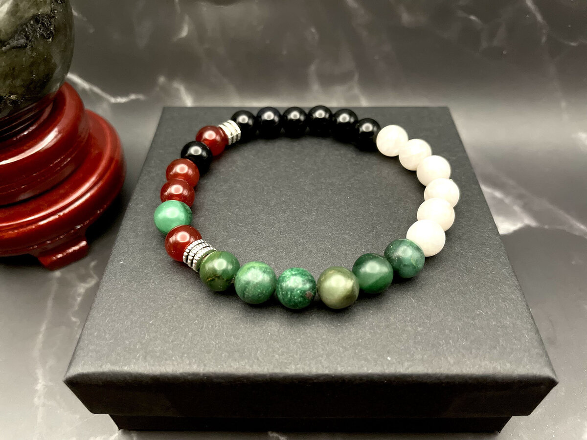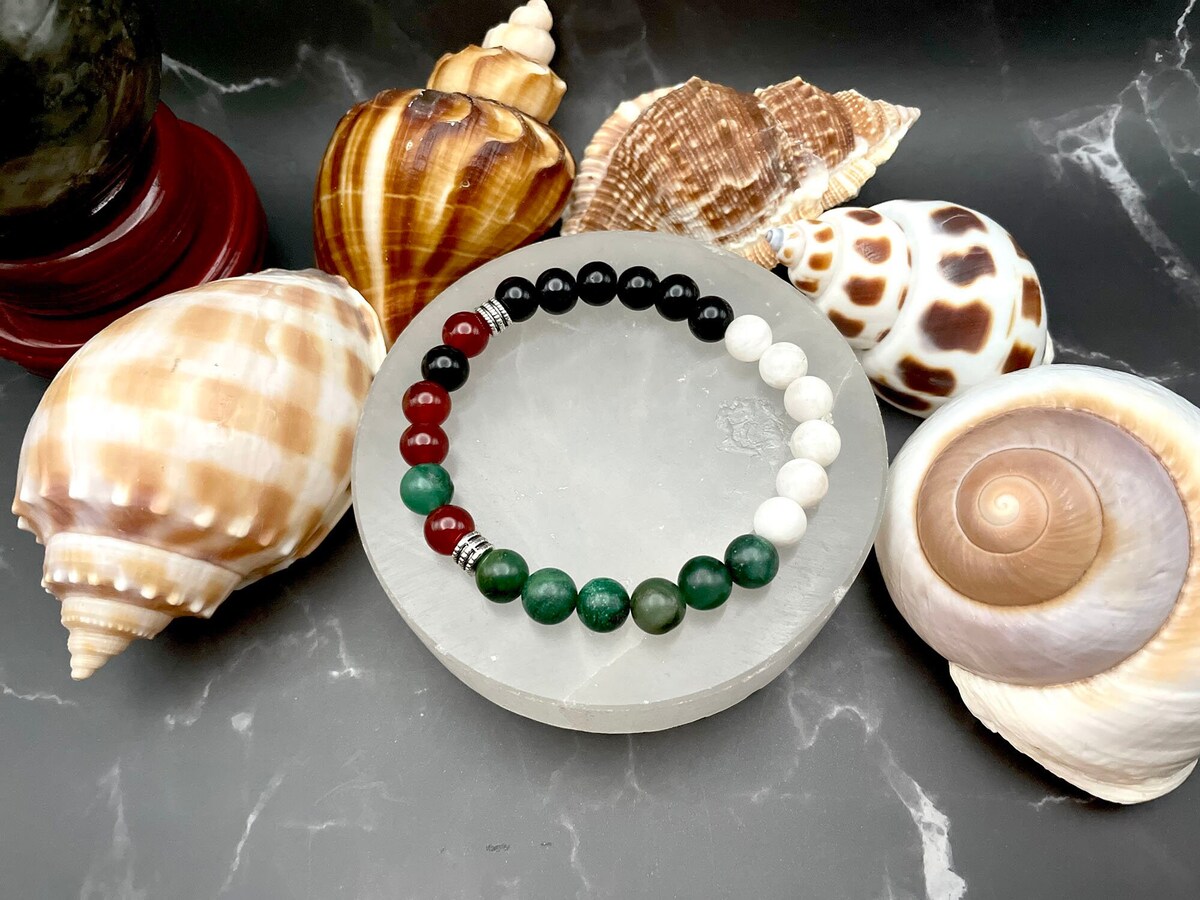 This gemstone bracelet represents the colors of the Palestinian flag. Colors consist of Green(Green Agate), White(Moonstone), Red(Carnelian), Black Pearl beads.